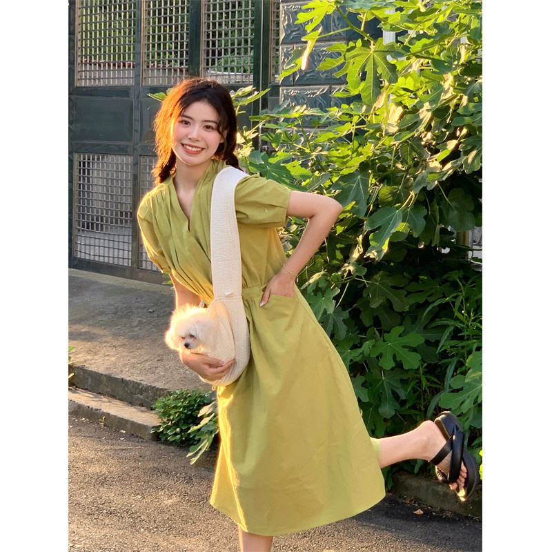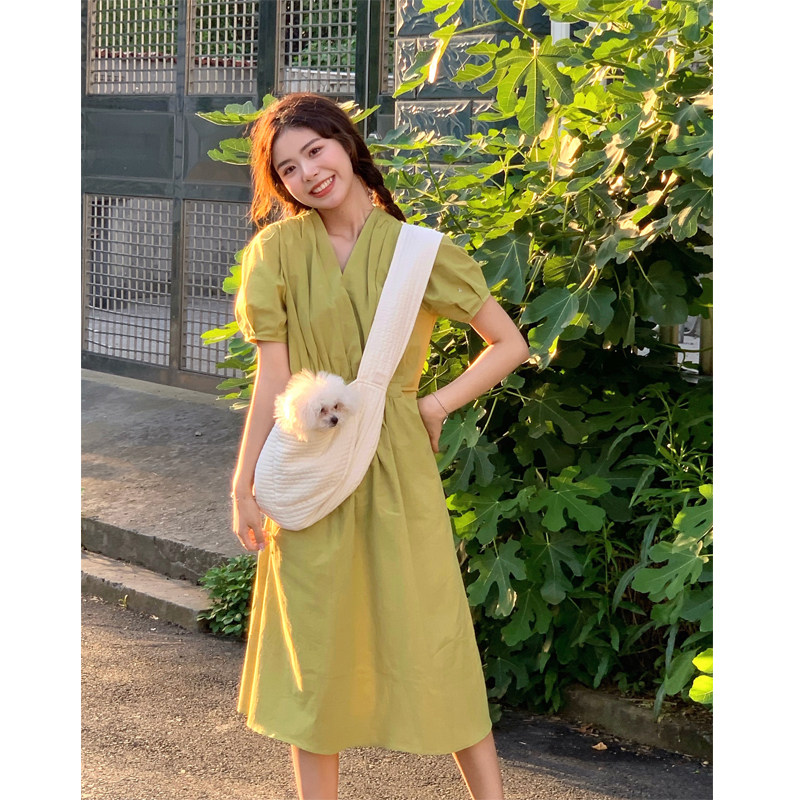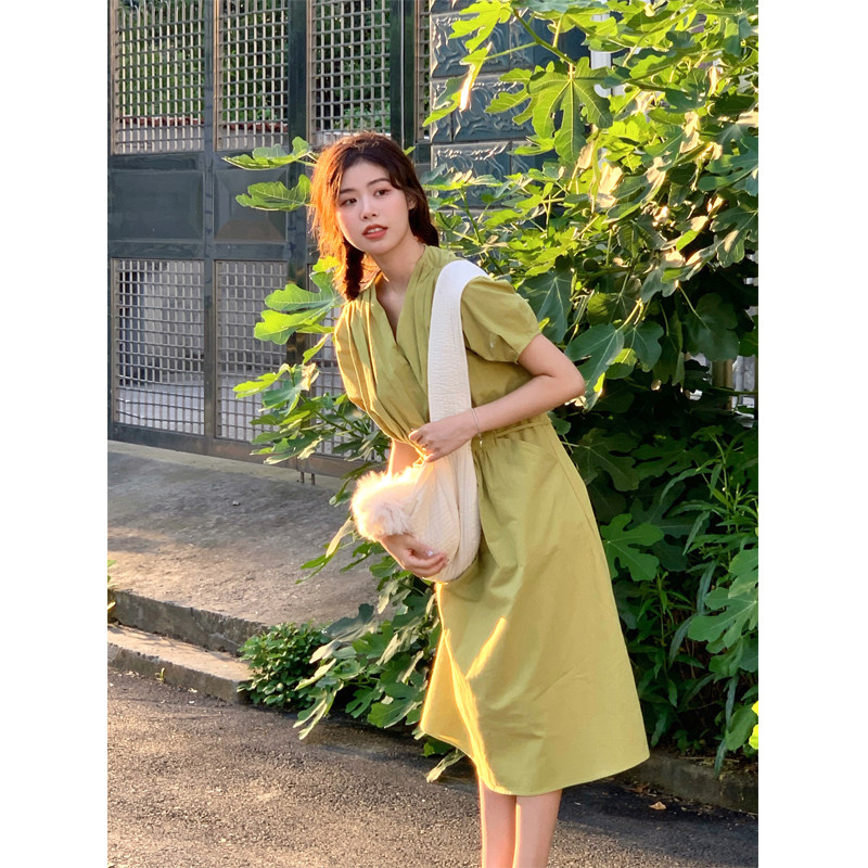 Clearance Special Cotton Linen Dress Women's Korean Version Slim Waist Slim Temperament V Neck Puff Sleeve Age Reducing Long Version Skirt