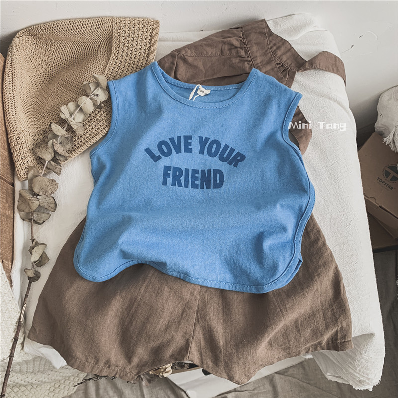 Foreign pie ultra-love ~ children all cotton casual letters sleeveless vest neutral male and female baby round collar loose blouses summer