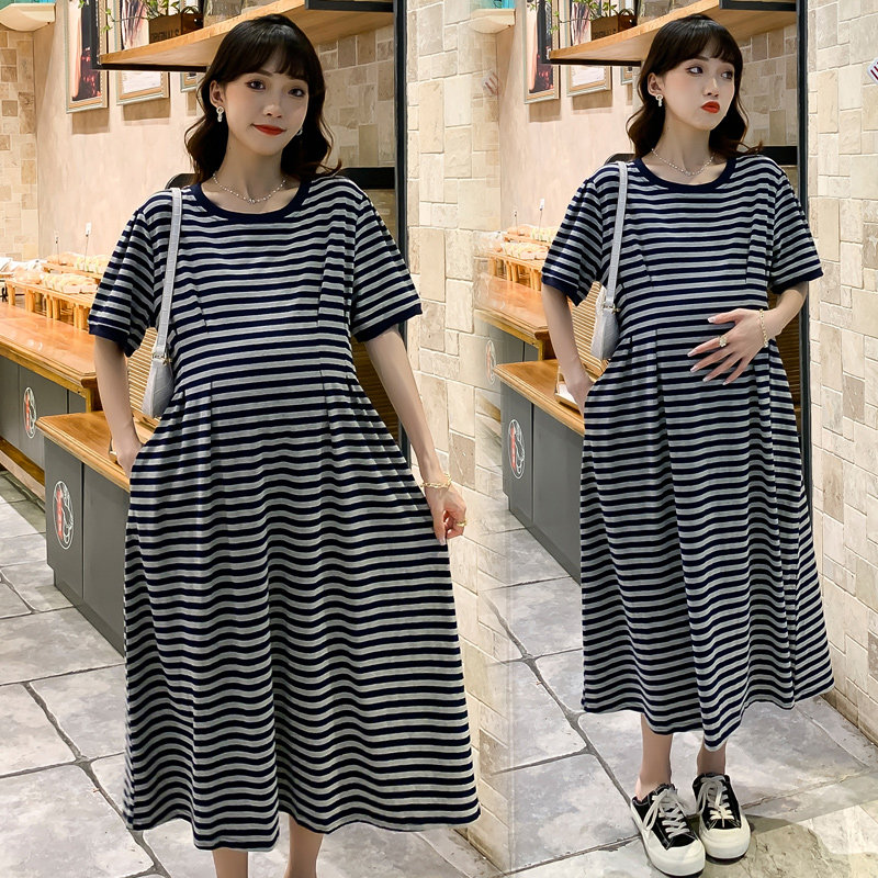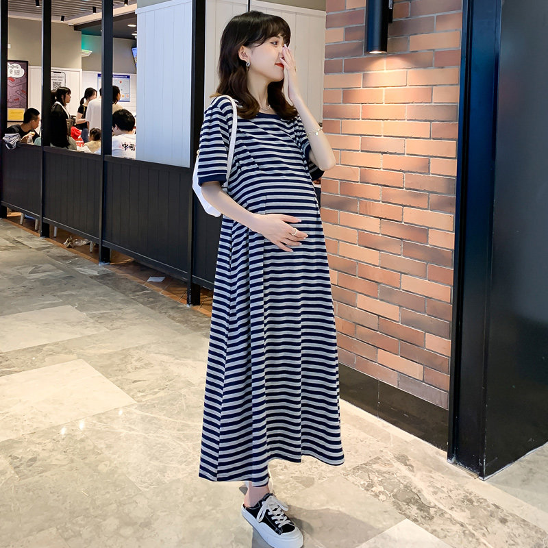 Pregnant woman summer dress new one-piece dress short sleeve pure cotton striped long dress Summer slim fit for pregnant woman's dress