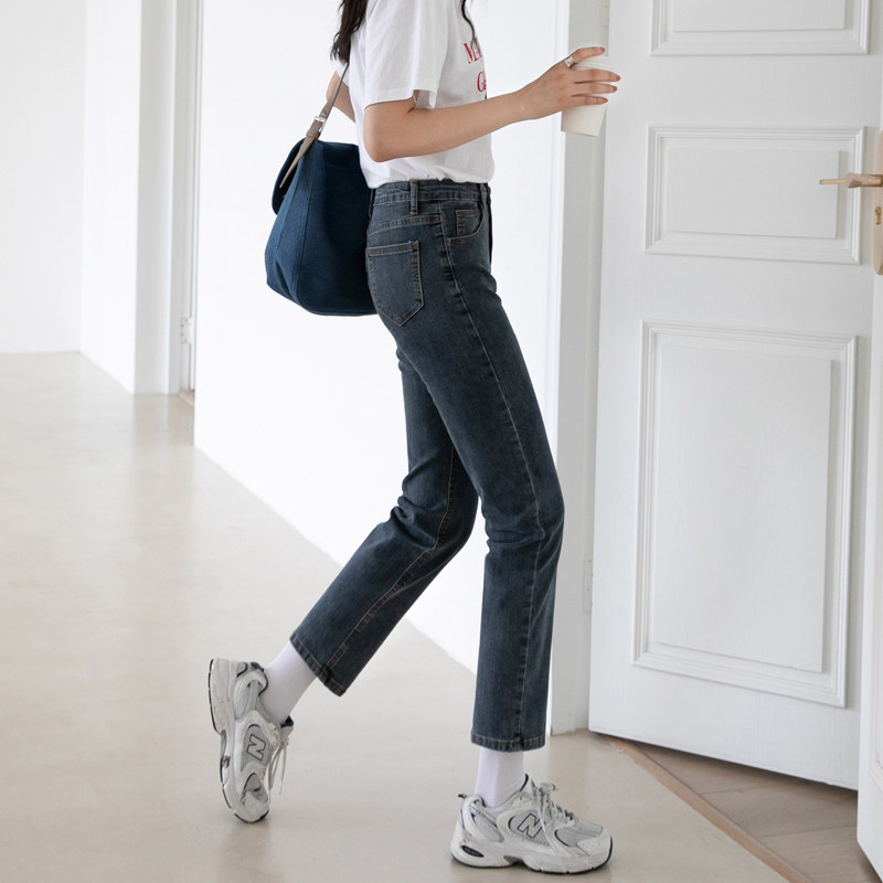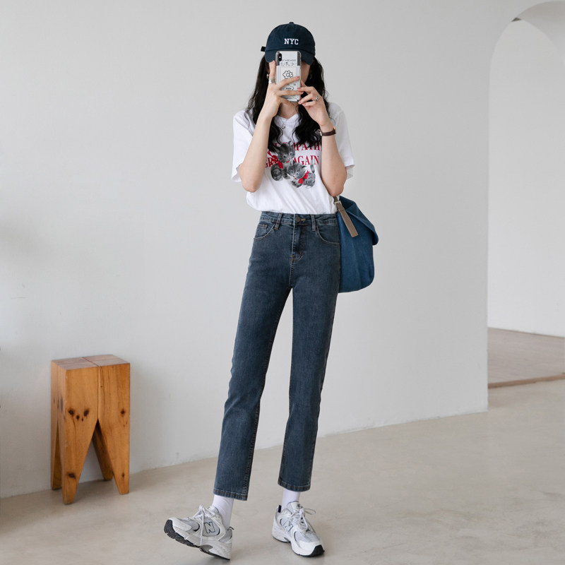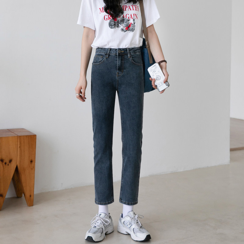 Straight jeans female nine spring 2022 new blue gray slim strength small high waist pipe pants