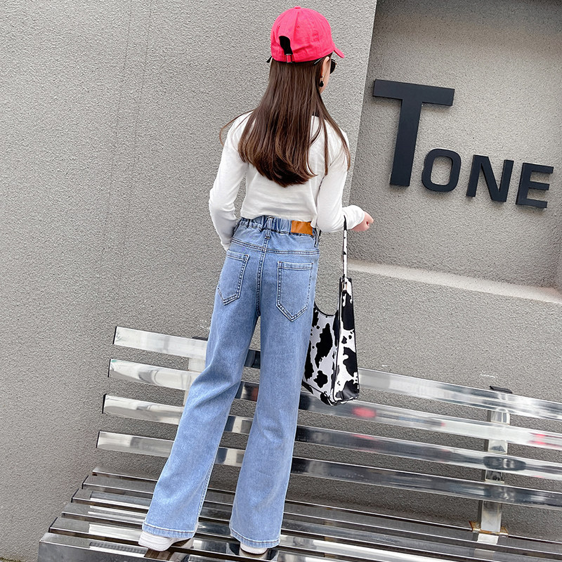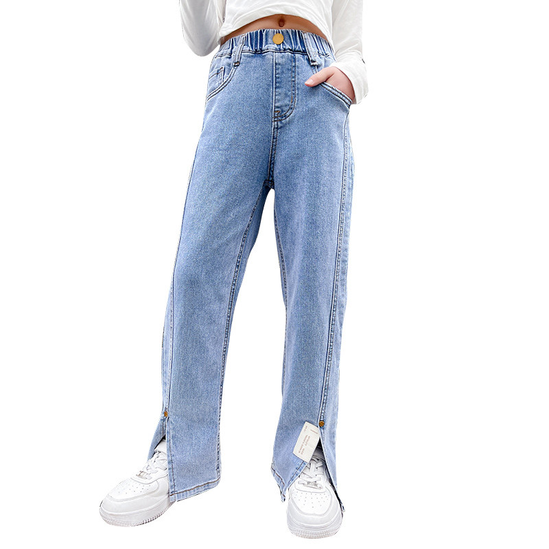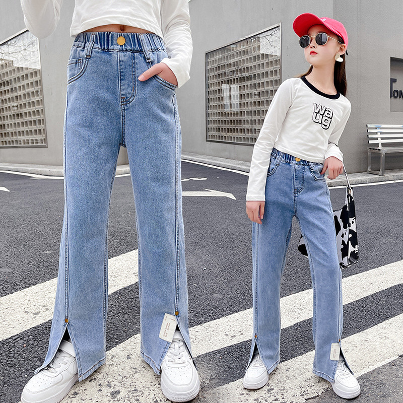 Girl's open fork jeans 2022 new spring and autumn CUHK Tong High waist tug wide leg Loose Straight Drum Pants Tide