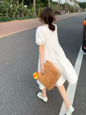 White dress Women summer 2021 New embossed pattern bubble sleeve French first love skirt high waisted doll skirt