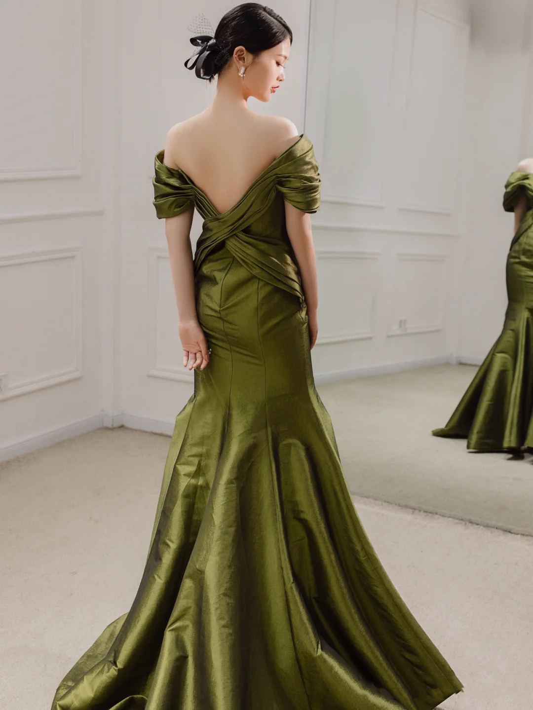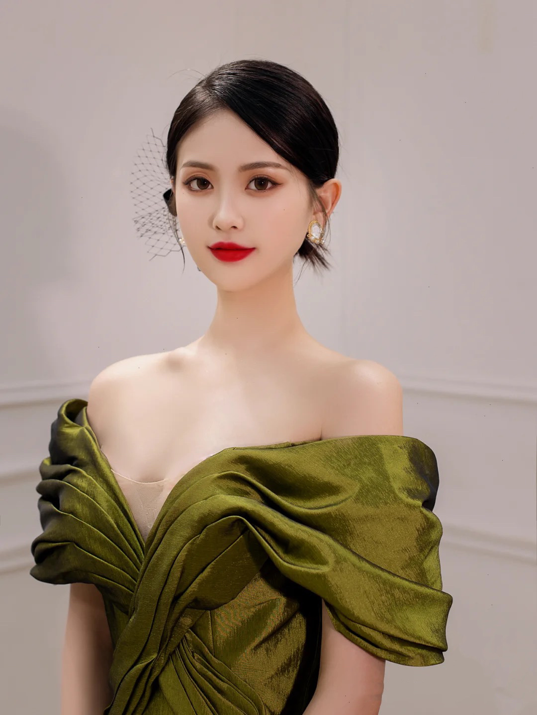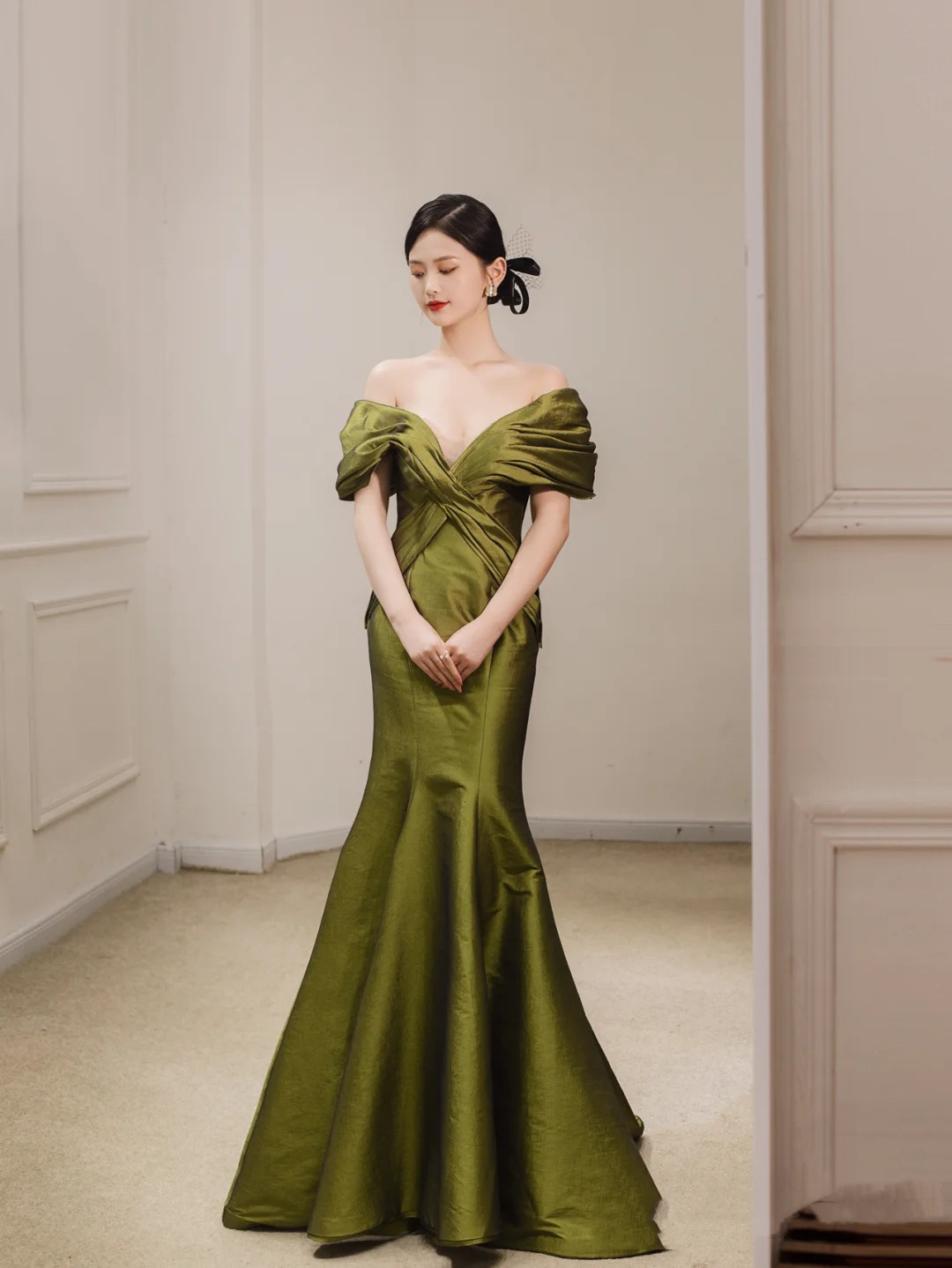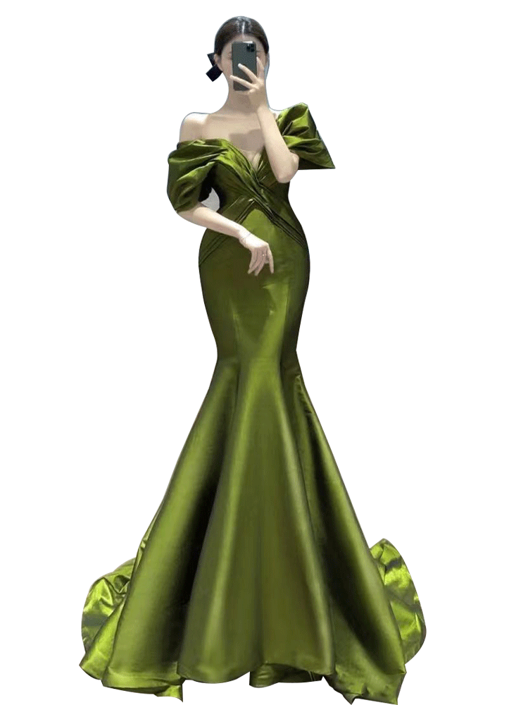 Green satin evening gown 2023 lined Shoulder Fish Tail for Atmospheric Dinner Party the Annual Meeting of the Performance Long Dresses-Taobao