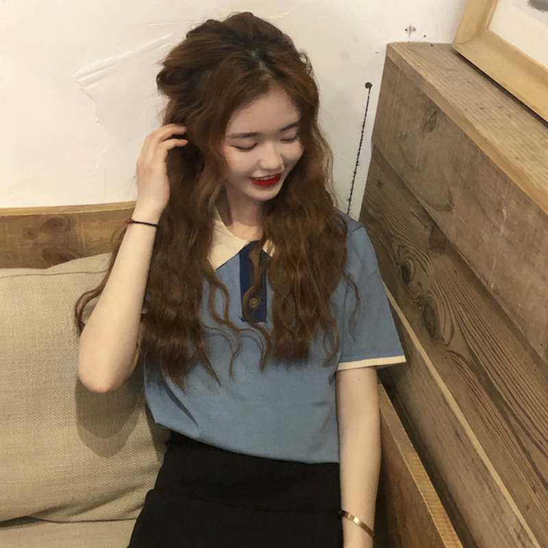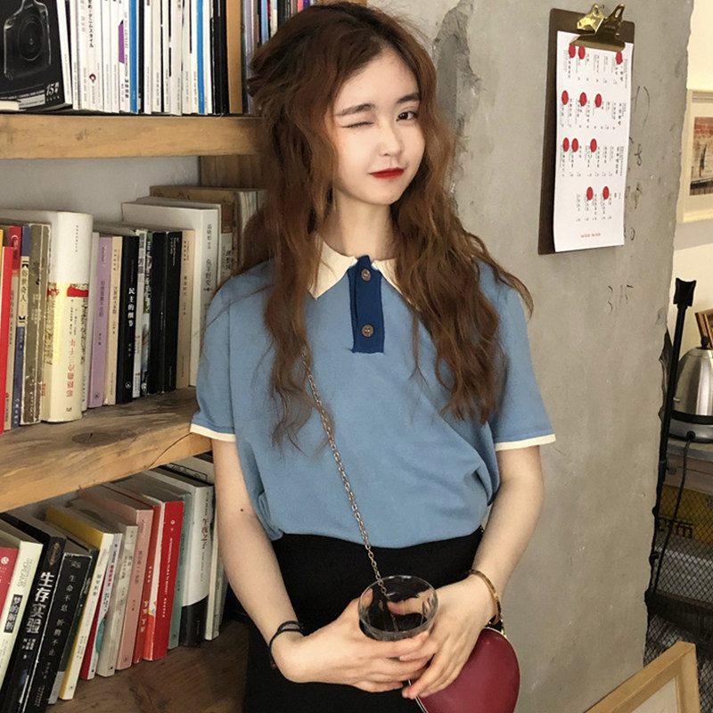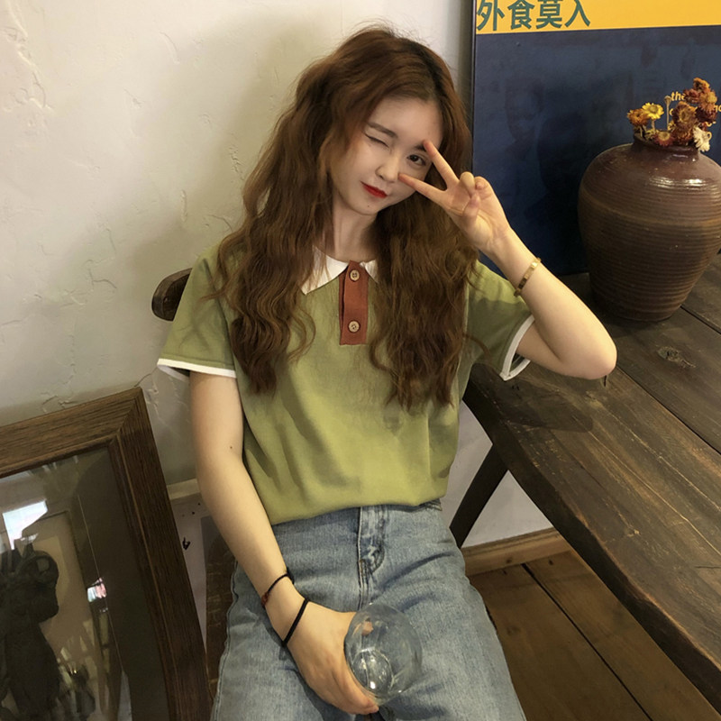 Summer new Korean version Loose Short Sleeve T-shirt Flipped Ice Silk Knit Cardigan Design Sensation Small Crowdwear Women Ins
