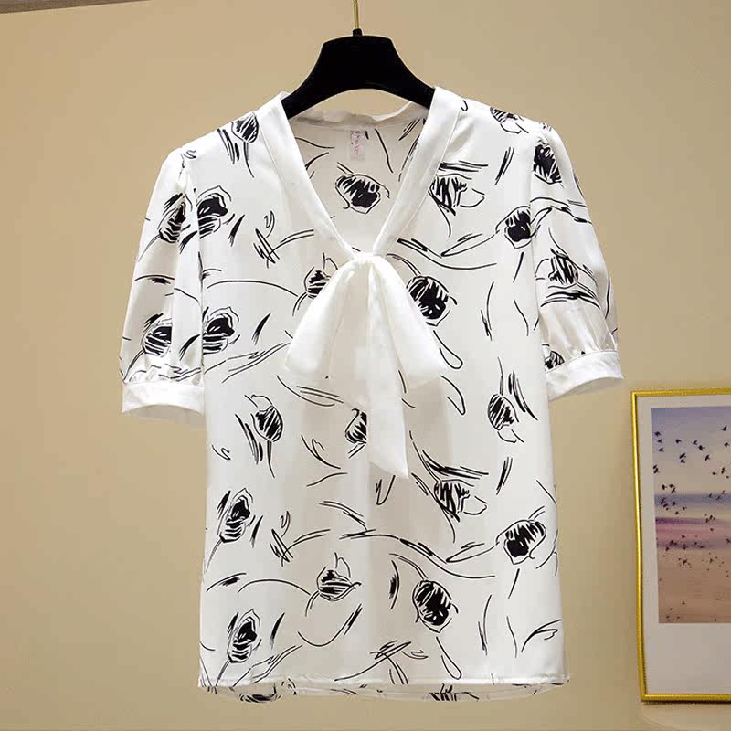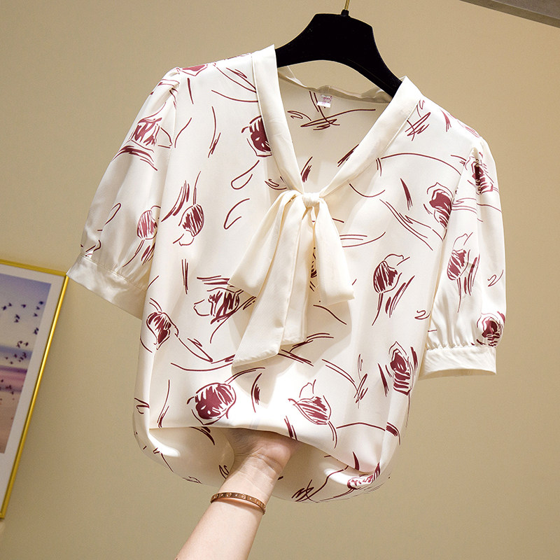Fairy floral chiffon shirt women's summer new bow print short-sleeved top fashion age-reducing Western-style shirt
