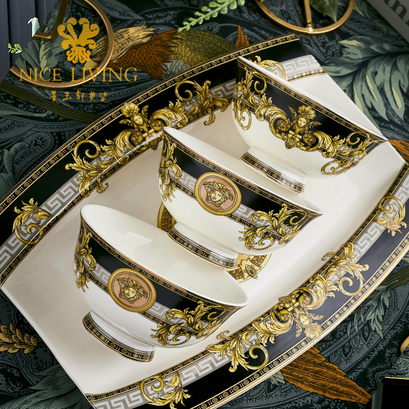 Jingdezhen high-end bone porcelain tableware suit Home European style Bowl Dishes Lavish Inlaid Gold Send Gift Western-style palace with porcelain
