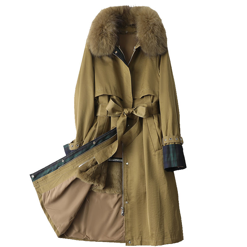 Click Khiana 2021 Winter New Henning Leather Grass Coat Lady Long Version Raccoon Fur Collar Rabbit Hair Liner Pike Suit