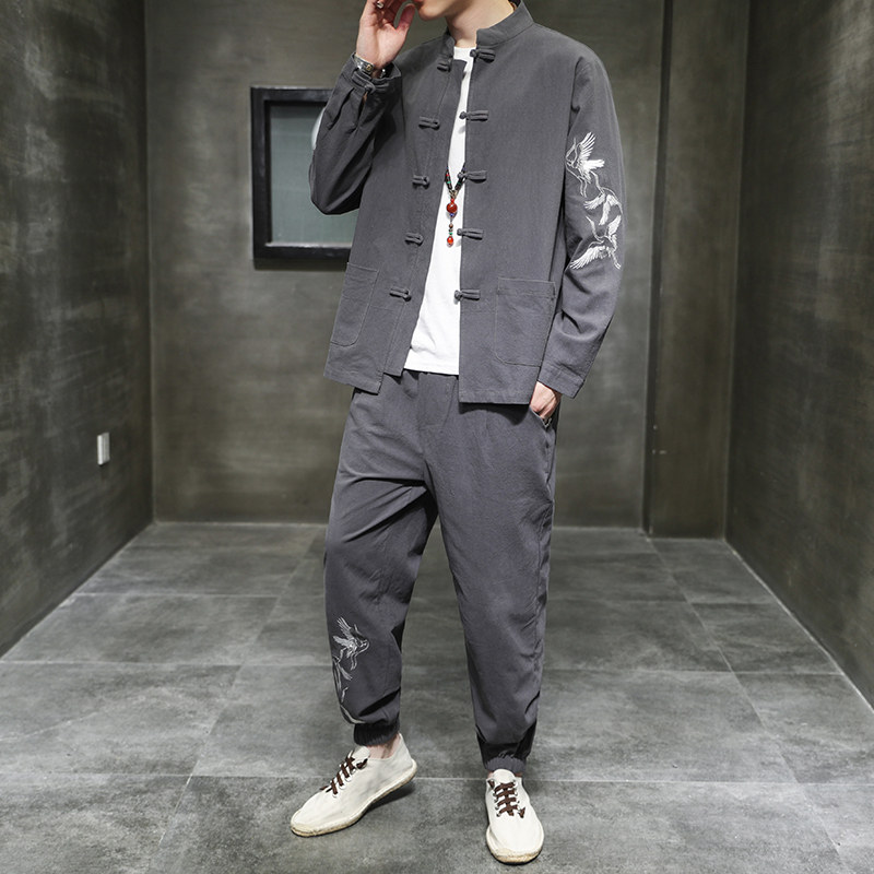 Chinese style Chinese pan button Tangclothing ancient wind one thousand cranes embroidered long sleeve shirt suit Male youth Republic of China Two sets