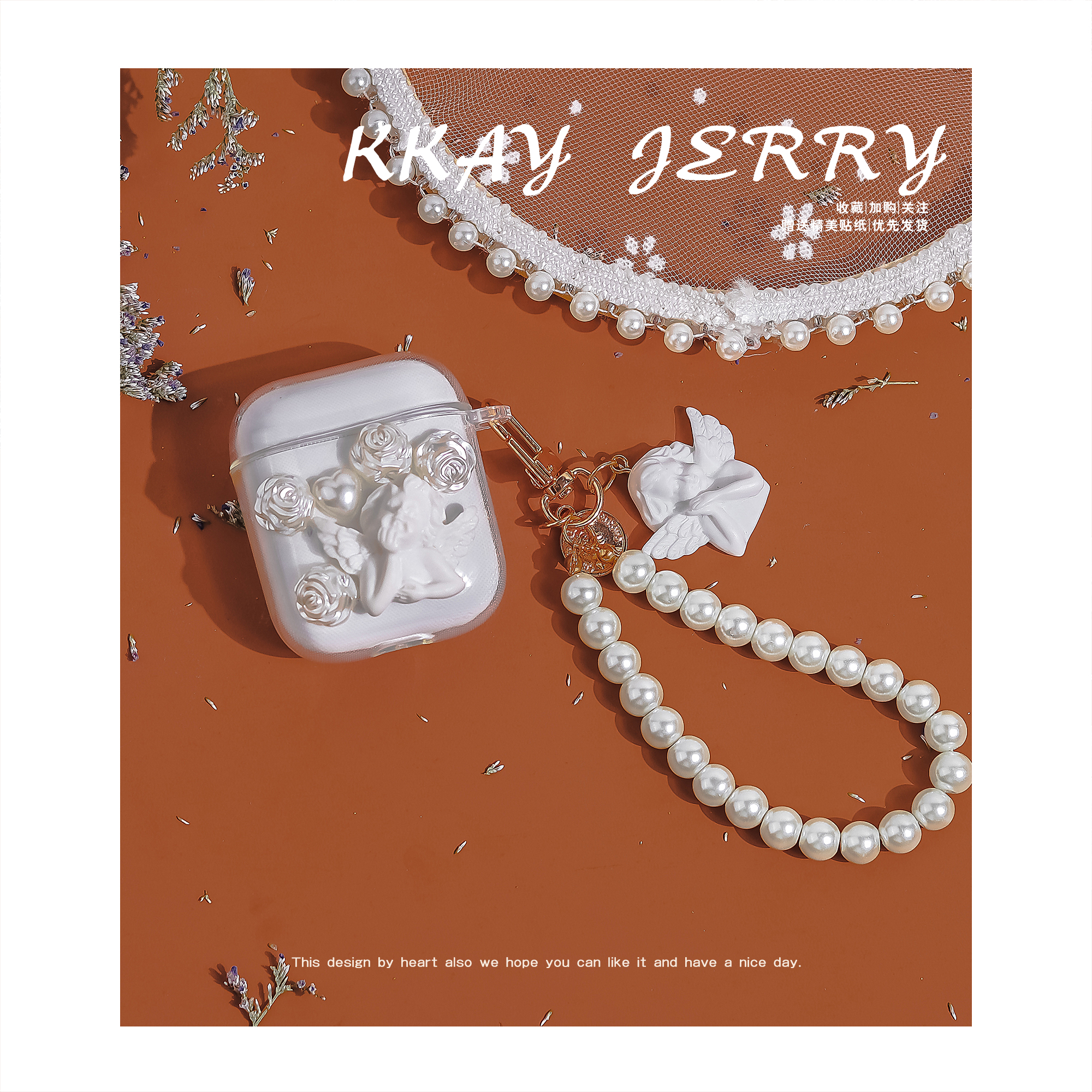 Through D angel, hanging pearl angel through D angel rose, hanging pearl angel through black, brown big butterfly, pearl chain through black, black big butterfly, pearl chain