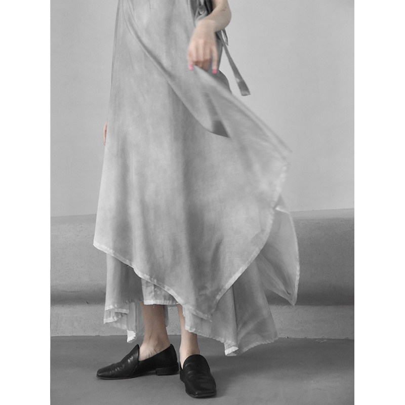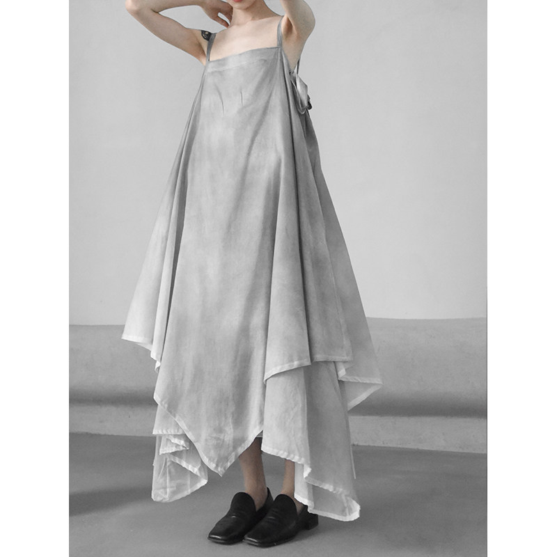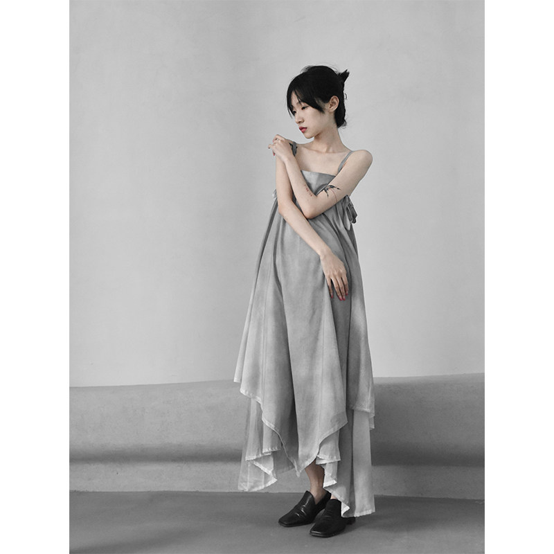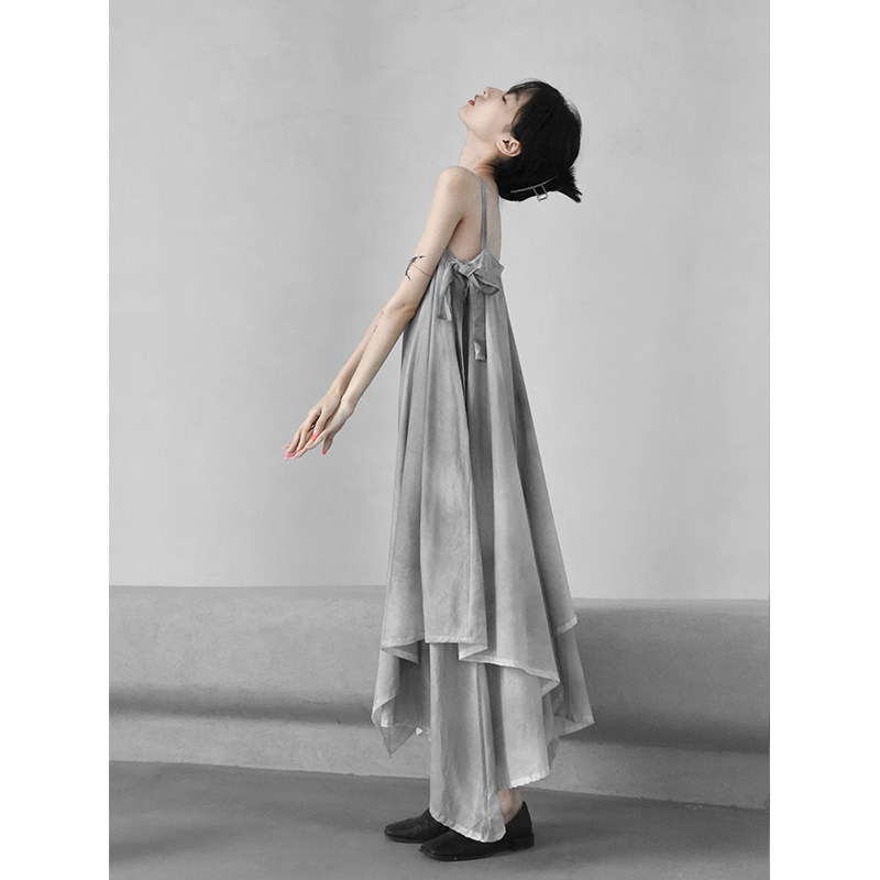 2021 summer handmade spray dyed gray dress bow ribbon sling dress loose irregular hem Dark Wind