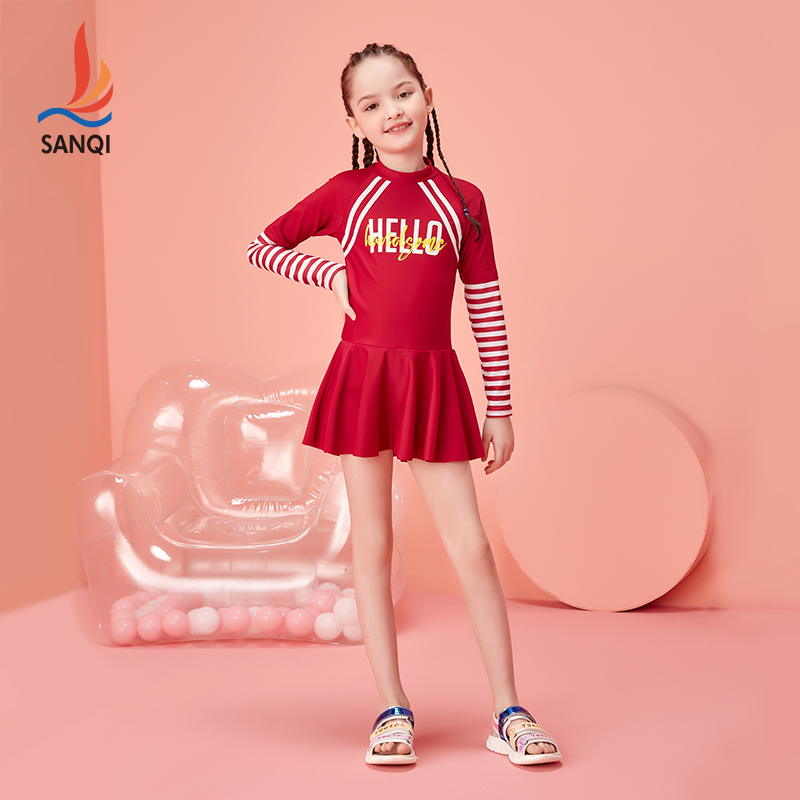 Sanqi children's swimsuit one-piece skirt girls cute long-sleeved sunscreen quick-drying small and medium-sized children's red sports wind swimsuit