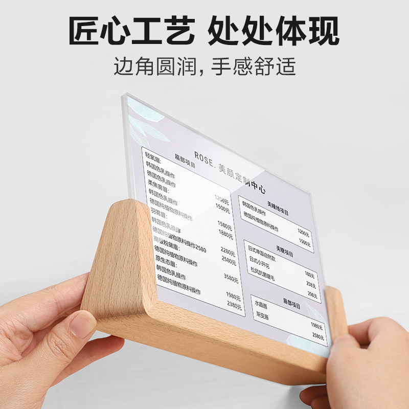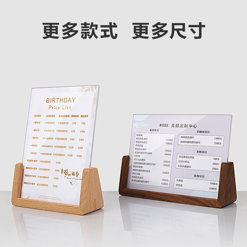 a4 table card holder display card U type solid wood menu display rack a5 beech wood standing plate hupeach wood billboard milk tea drink price list swing table custom-made acrylic table deck plate goods price tag