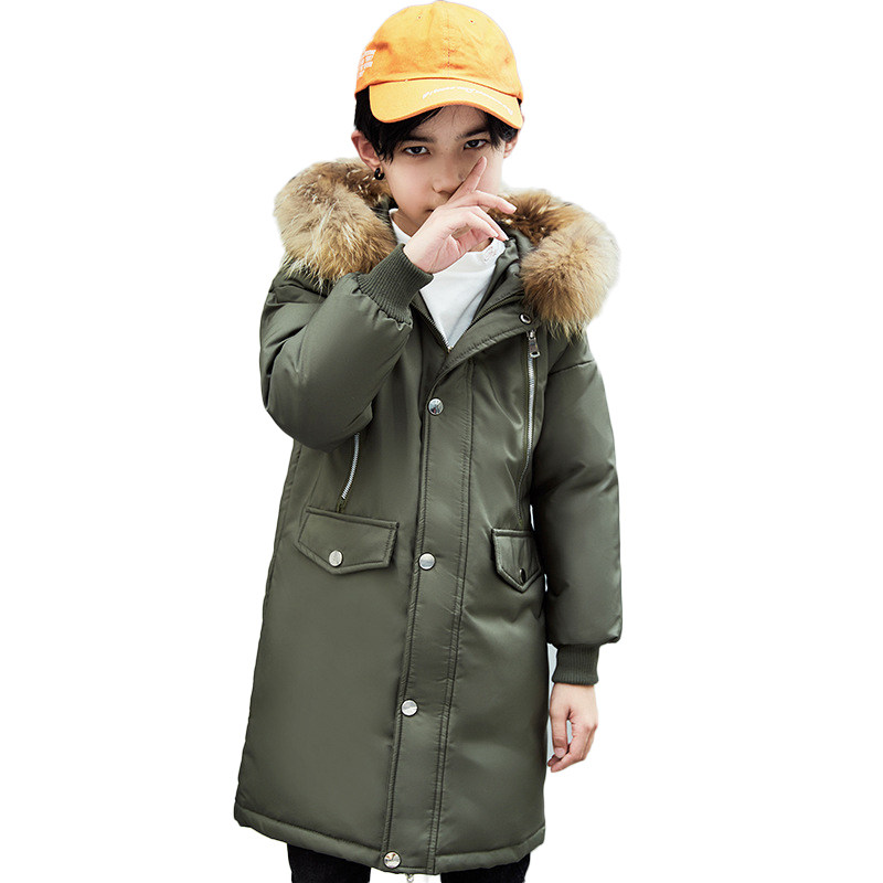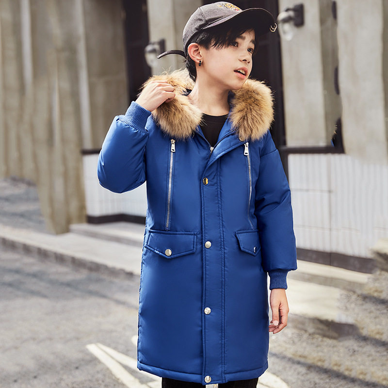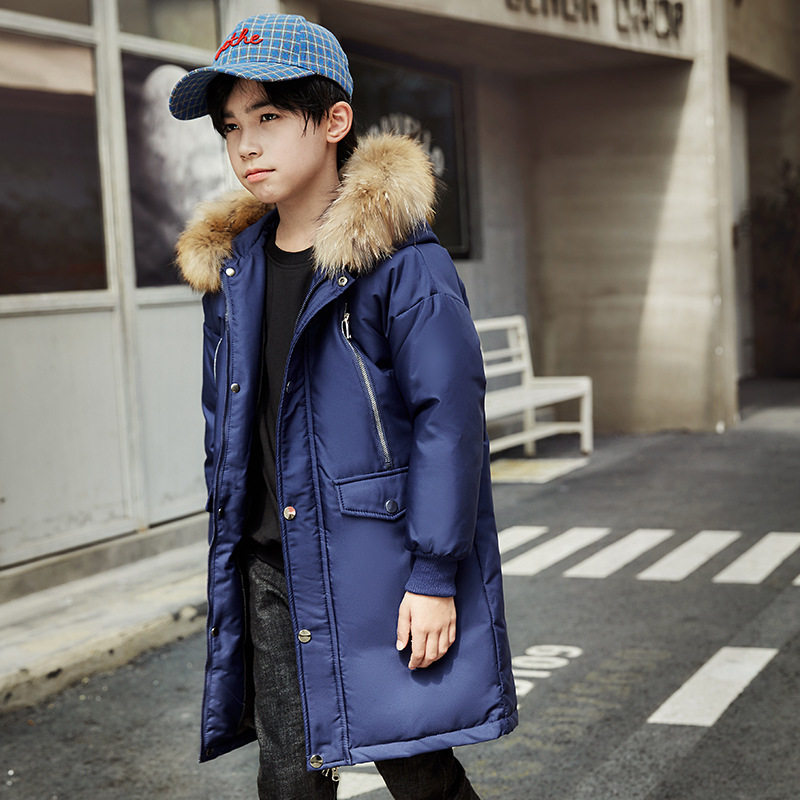 Boys and children's mid-length down jacket thick green blue black orange coat big boy fur collar hooded cotton jacket winter - Taobao