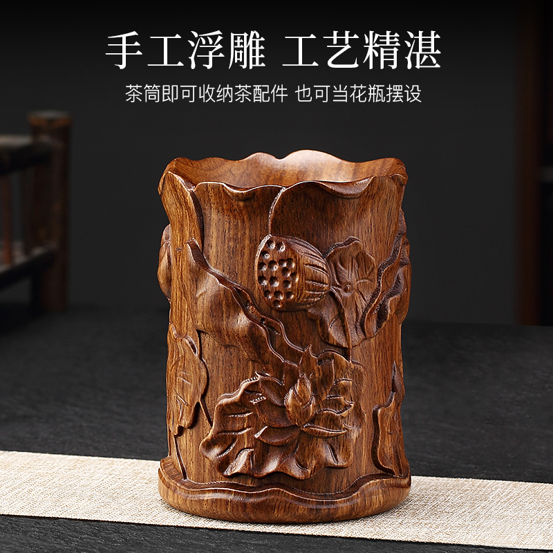 Longshantang Tea Road Six Flowers Pear wood Gongfu tea with black sandalwood tea with Chinese style Carved Tea Cylinder Tea for Home
