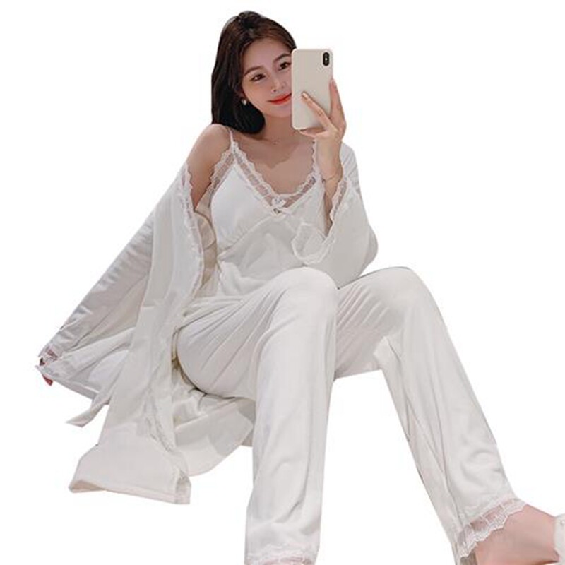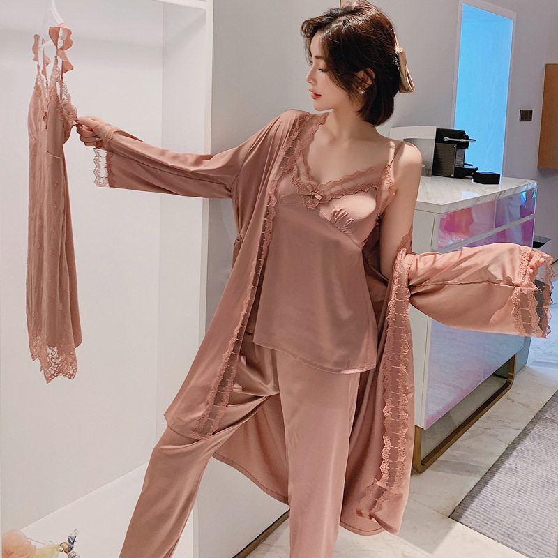 SADO YINER summer thin section ice silk pajamas women with chest pad sexy lace sling home clothes three-piece suit