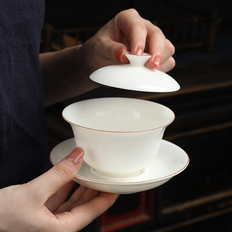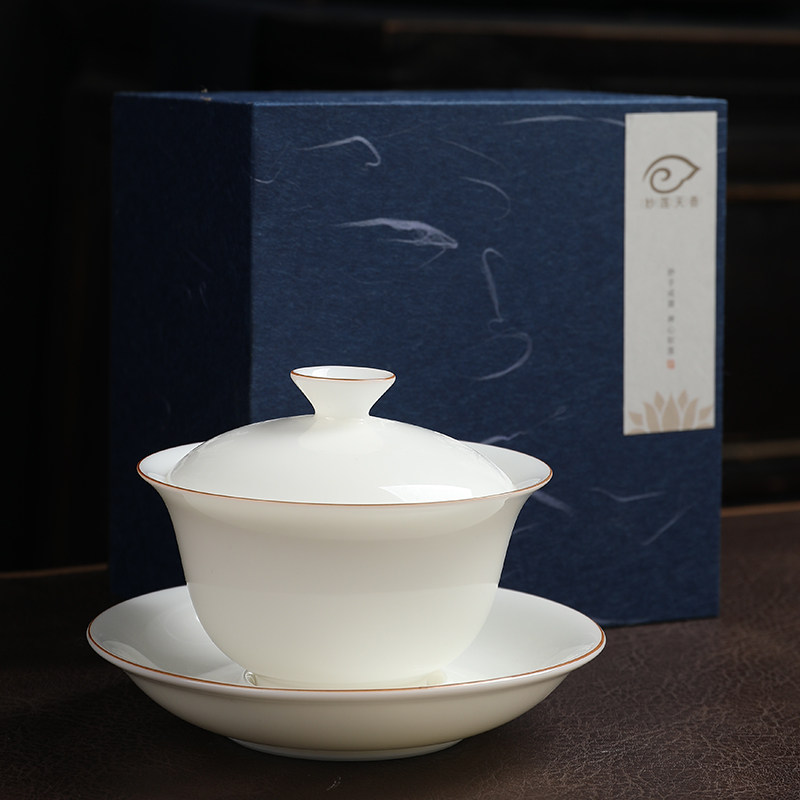 Wonderful lotus-scented goat grease jade porcelain Ruyi 3-only cover bowl Upper glazed white porcelain Ceramic Tea Cup single