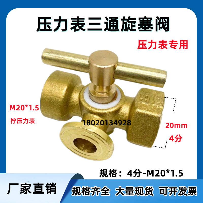 Full copper high-pressure thickened pressure meter three-way screw plug valve door boiler Bronze Cauker with exhaust hole 4 minutes M20x1 5