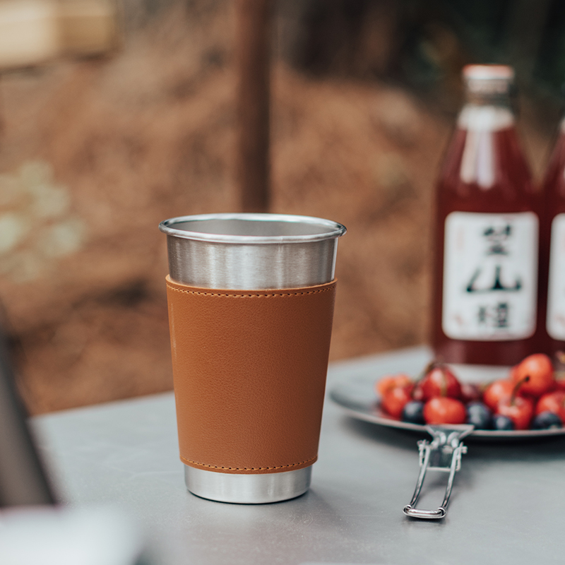 Outdoor camping stainless steel water glass with leather suit portable 304 edible grade anti-scalding coffee cup beer mug cup