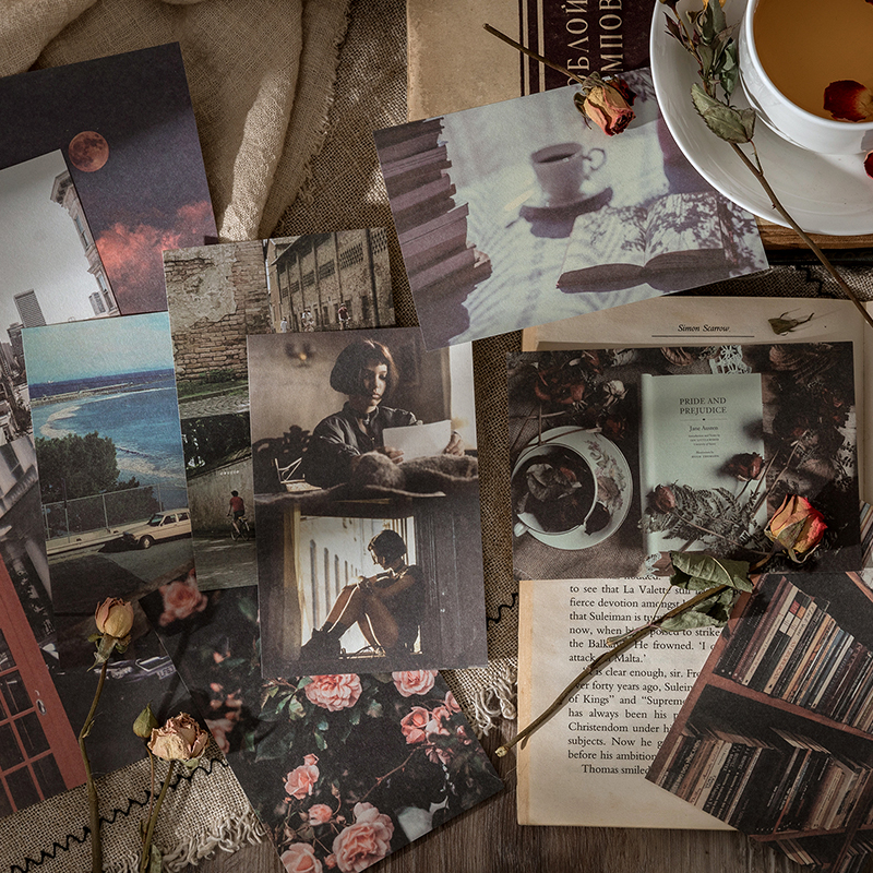 (1) Baking Magazine (2) nostalgic book page (3) Japanese language novels (4) era clippings (5) Negatives camera (6) Academic charts (7) Collections Score (R) Letter Memory