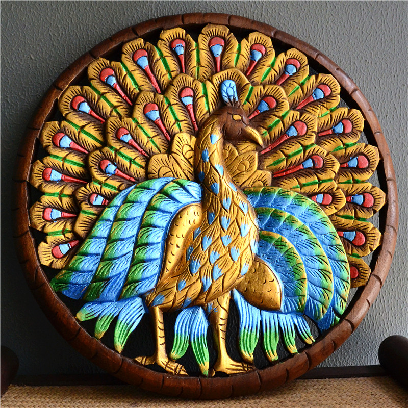 Thailand imported wall decoration pendant teak wood carving board painted peacock opening screen Southeast Asian style decoration living room