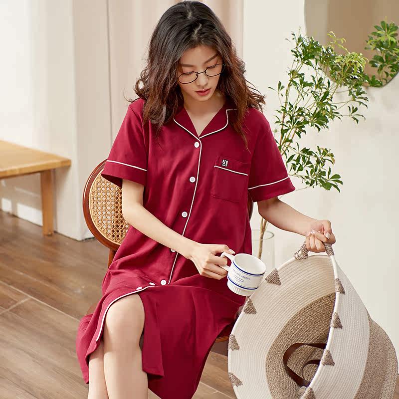 Summer Korean version Ms pure cotton cardiovercoat flap collar short sleeve sleeping dress This life year Great red New wedding Festive All-cotton Home Dress