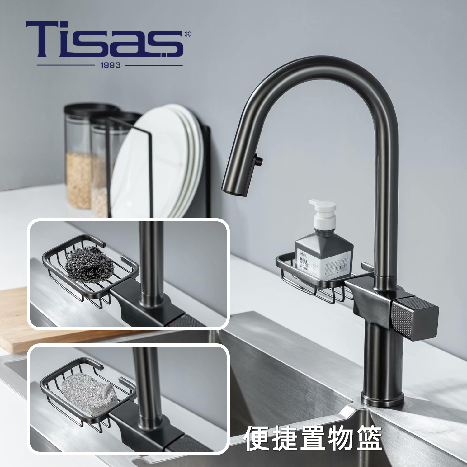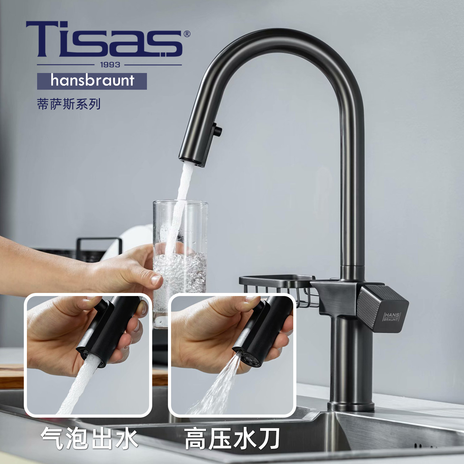 German Tisas pull-out kitchen faucet with storage basket gun gray brushed gold hot and cold sprinkler dish basin