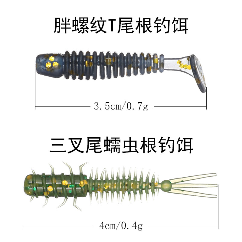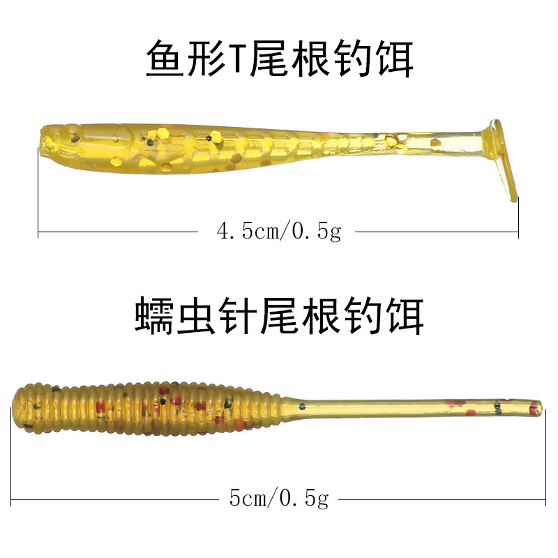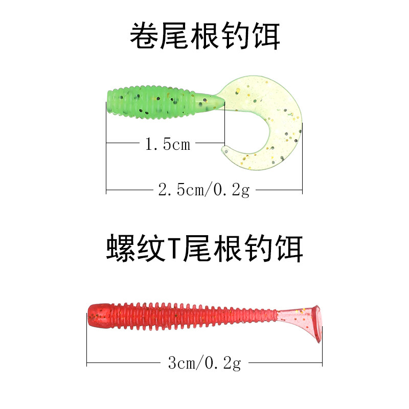 50 strips of micromaterial soft bait root fishing bait roll tail T tail 3cm threaded green slightly rounder red eye stone dog male black head yellow bait
