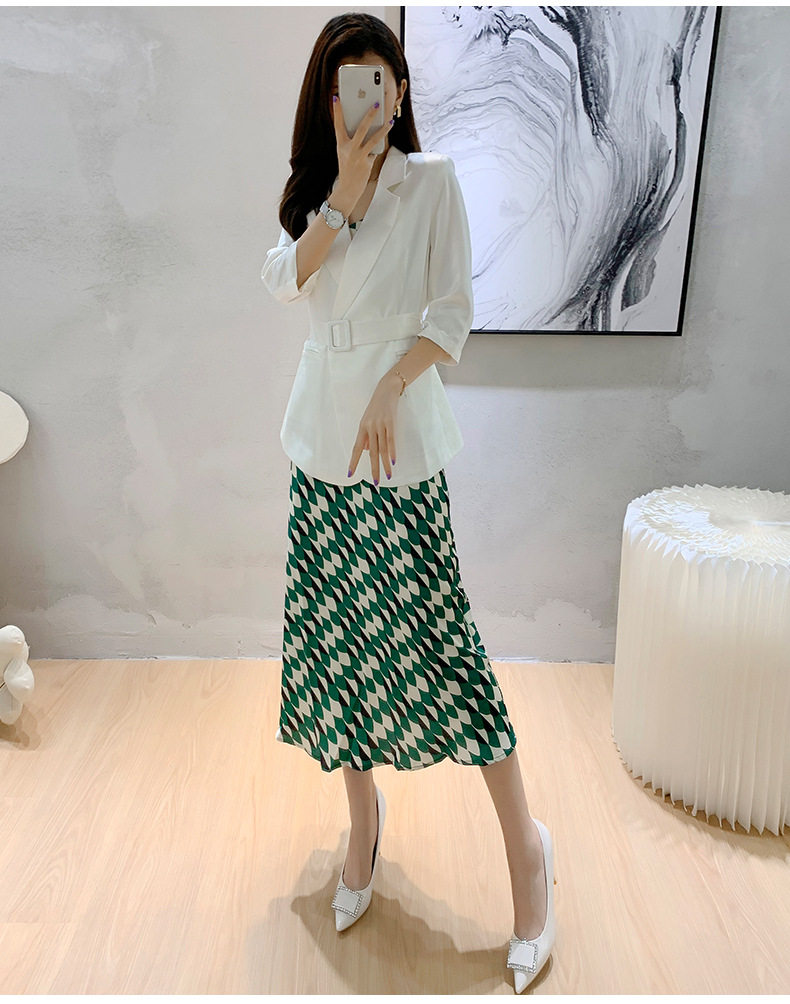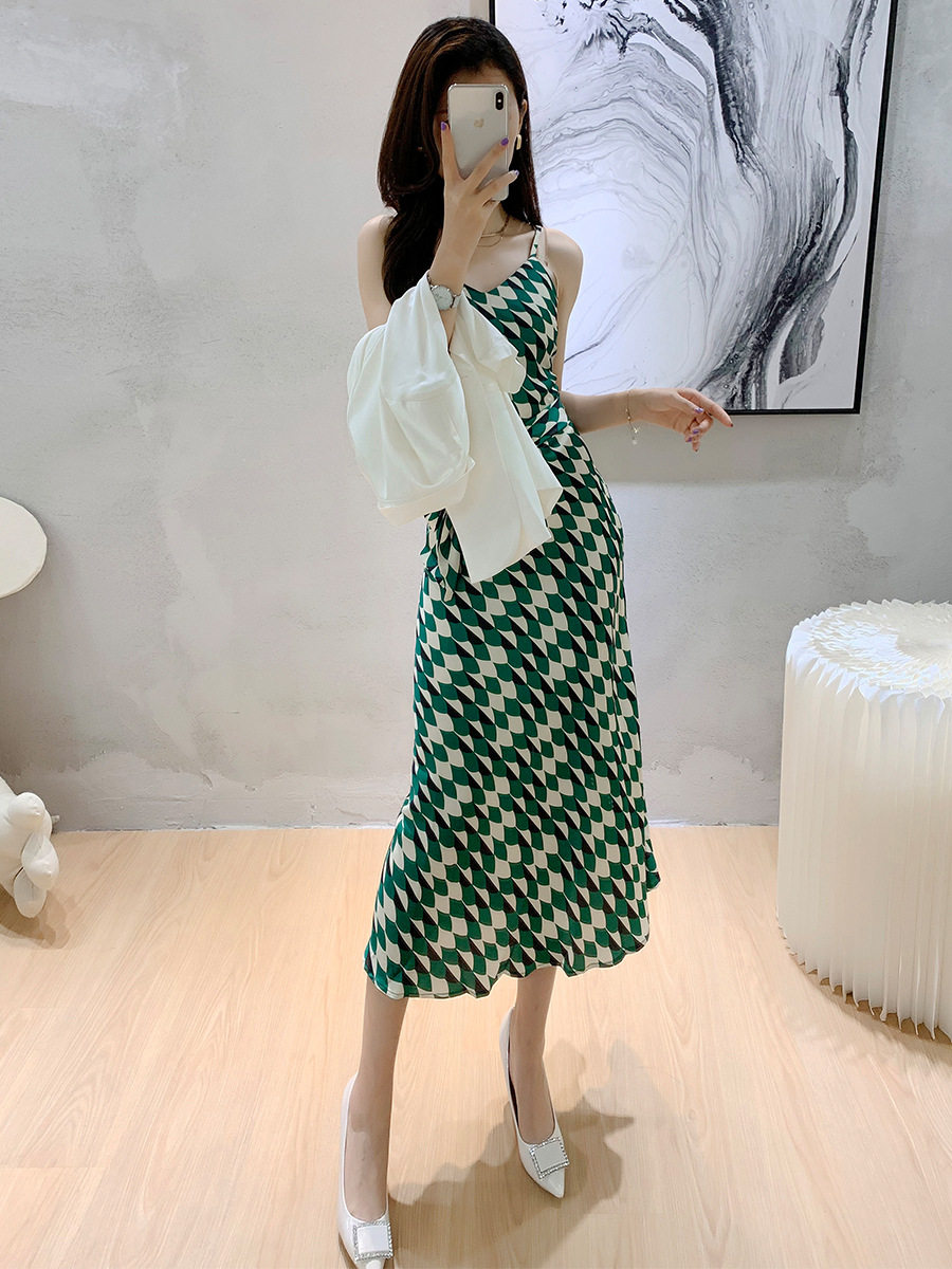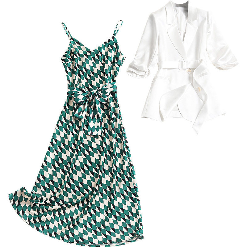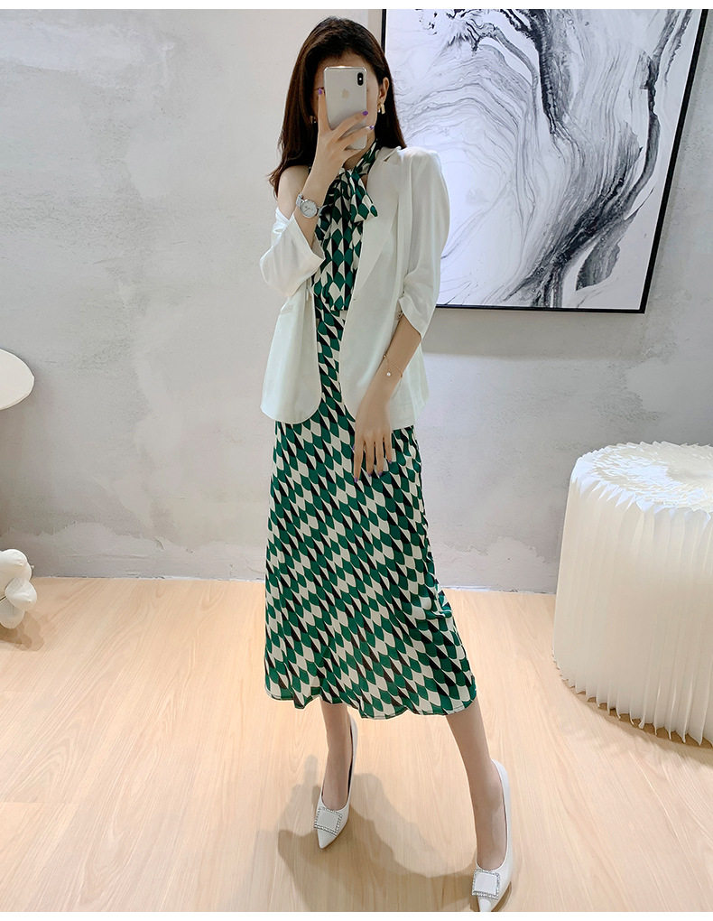 sandro sfpro2021 summer green printed long version harness foreign dress high-end white small suit suit woman