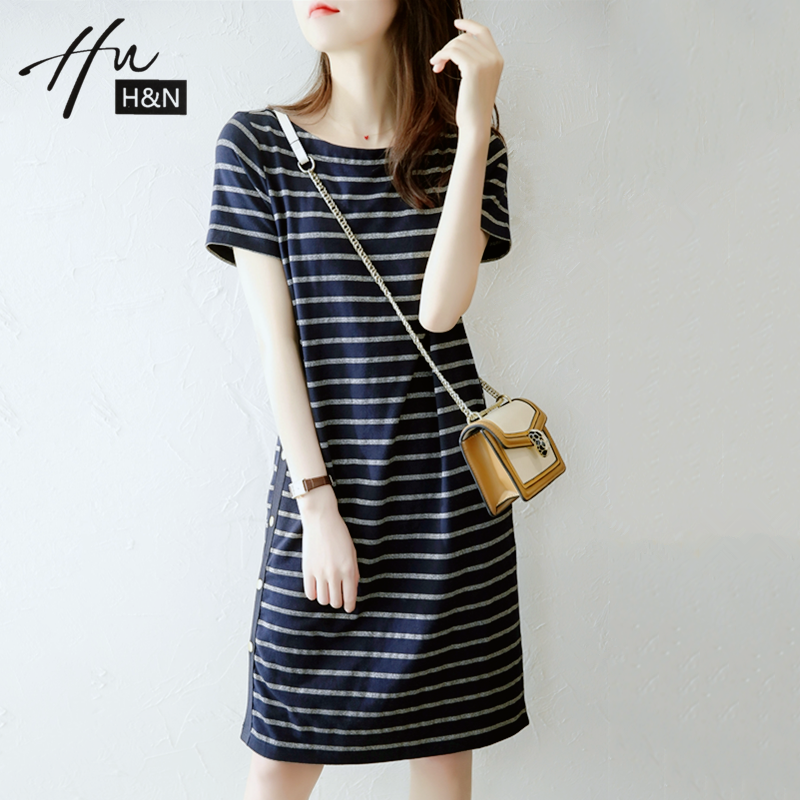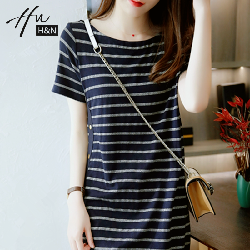Striped Ocean Dress Women Summer 2022 New Side Buckle Design Sense Small slim temperament minimalist Straight tube T-shirt dress