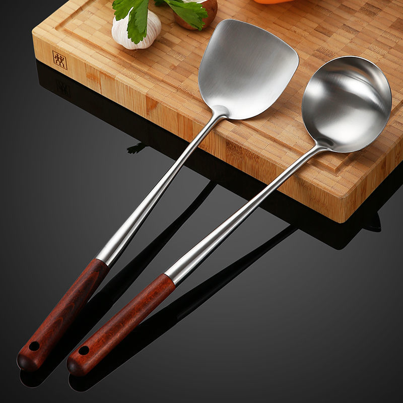 304 stainless steel pan shovel fried vegetable turner anti-scalding lengthened floral pear wood handle chef saute vegetable spoon Home spade spoon suit