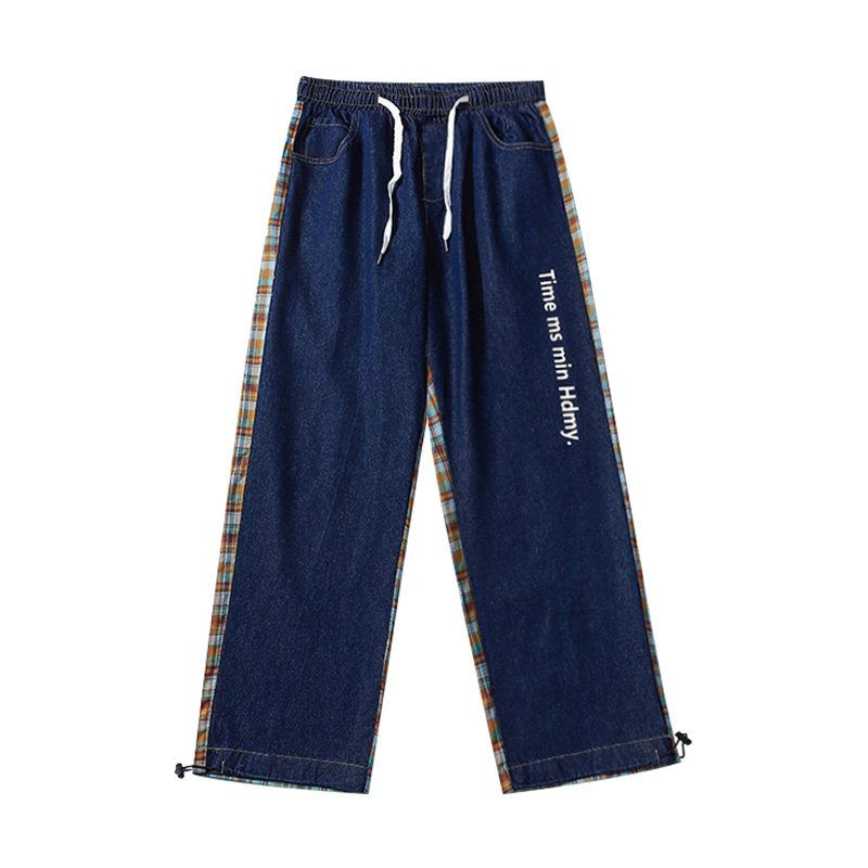 American high street loose wide-leg jeans men's trendy brand vertical plaid stitching design casual straight long pants