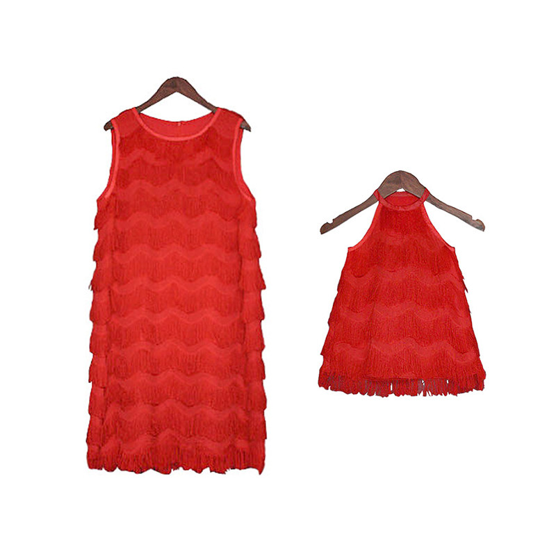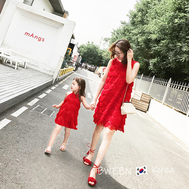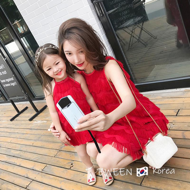 Net red parent-child clothing Korean version of children's wear 22 summer dress foreign gas mother and daughter wear sweet Sanya seaside fringed red dress