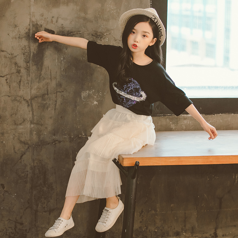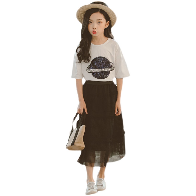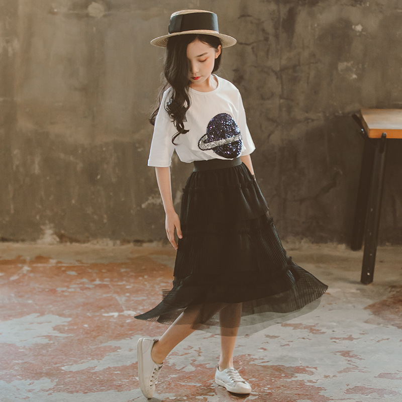 Girls summer short-sleeved t-shirt suit children's princess skirt long skirt 13-year-old girl clothes 11 Western style gauze skirt 12