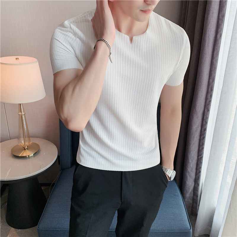 Summer thin ice wire short sleeve T-shirt men without trace elastic hollow collar body shirt pure tide tops