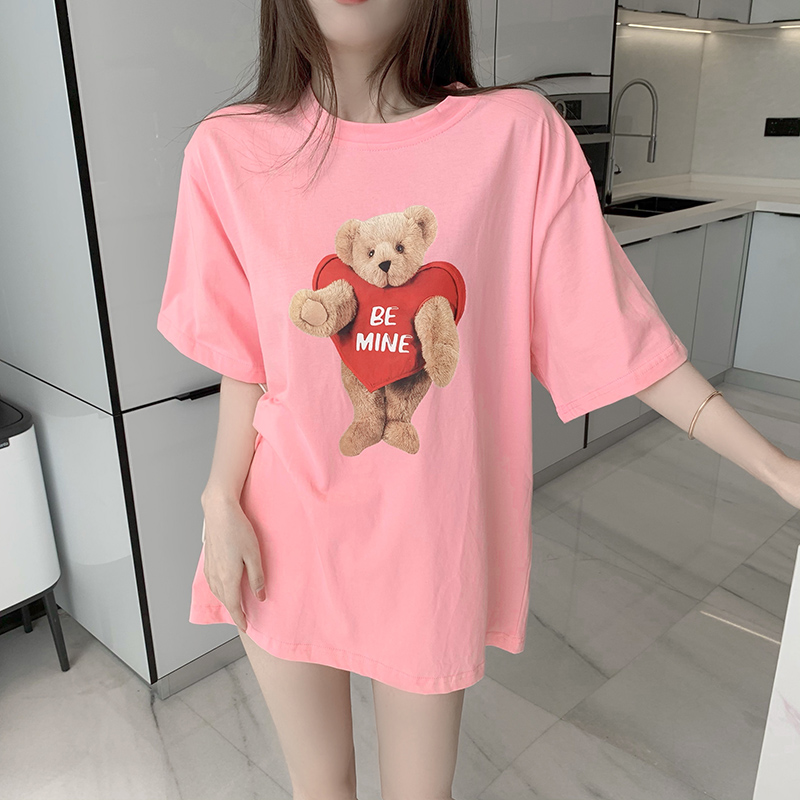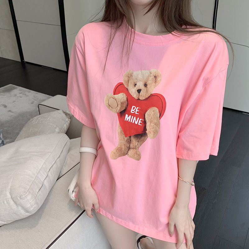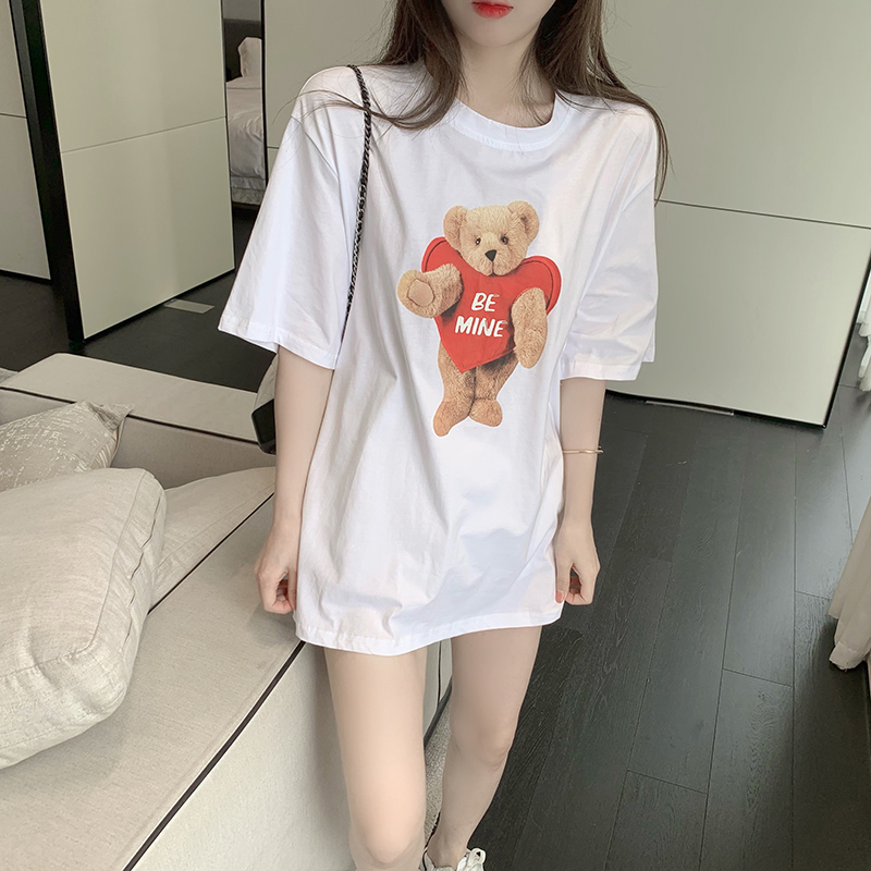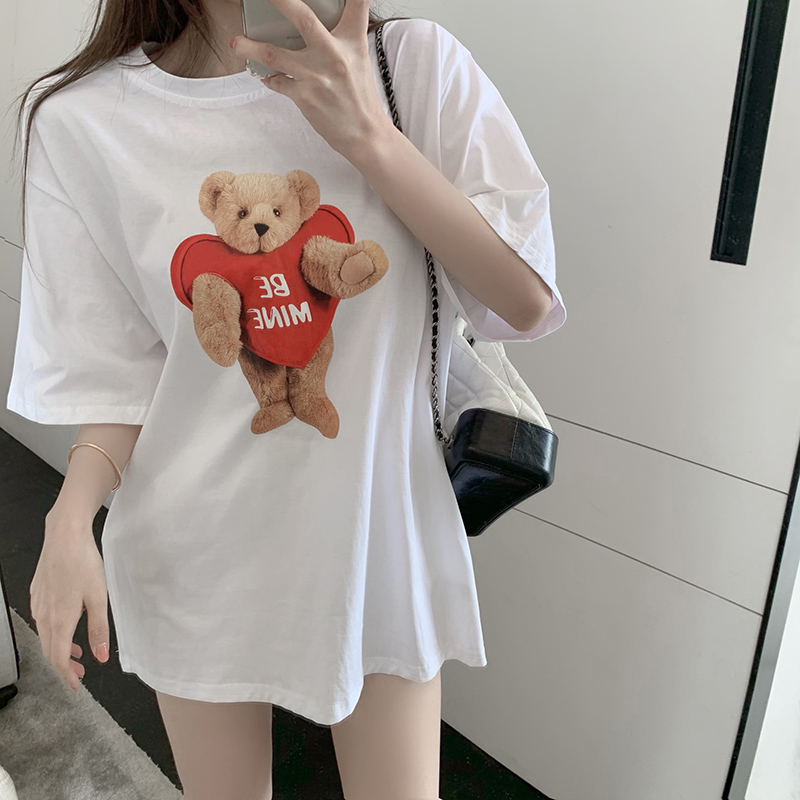 2022 summer new simple loose medium-length version bear print top design sense niche short-sleeved t-shirt women
