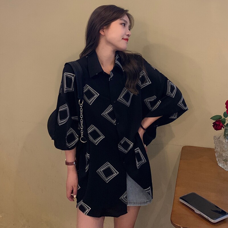 South Korea Retro Printed Foreign Pie Shirt Woman 2021 New Summer Snow Textile blouses loose large size 100 lap short sleeve shirt