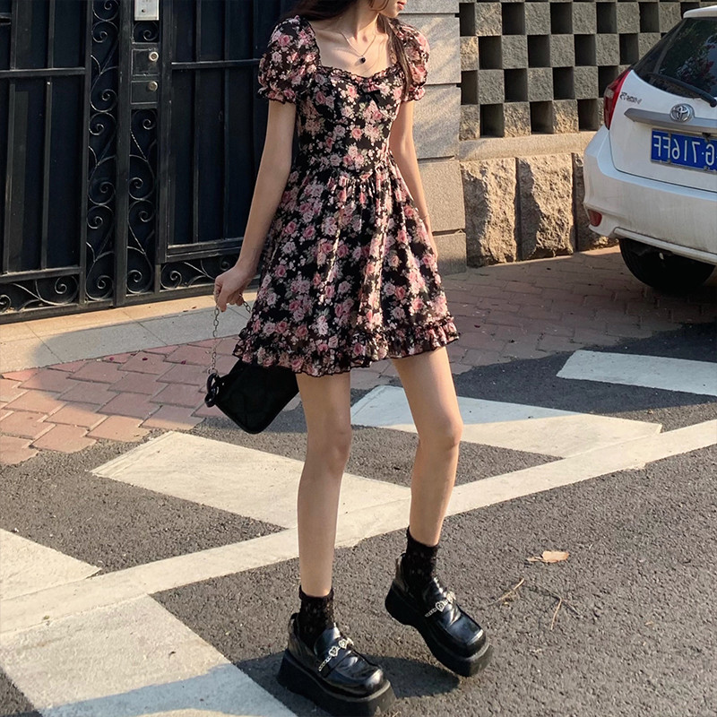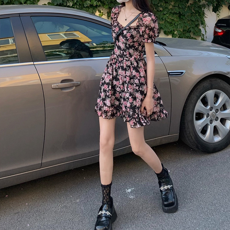 WAHJU Paris Wild Rose floral dress Women's summer tea break dress First love skirt Chiffon a-line skirt