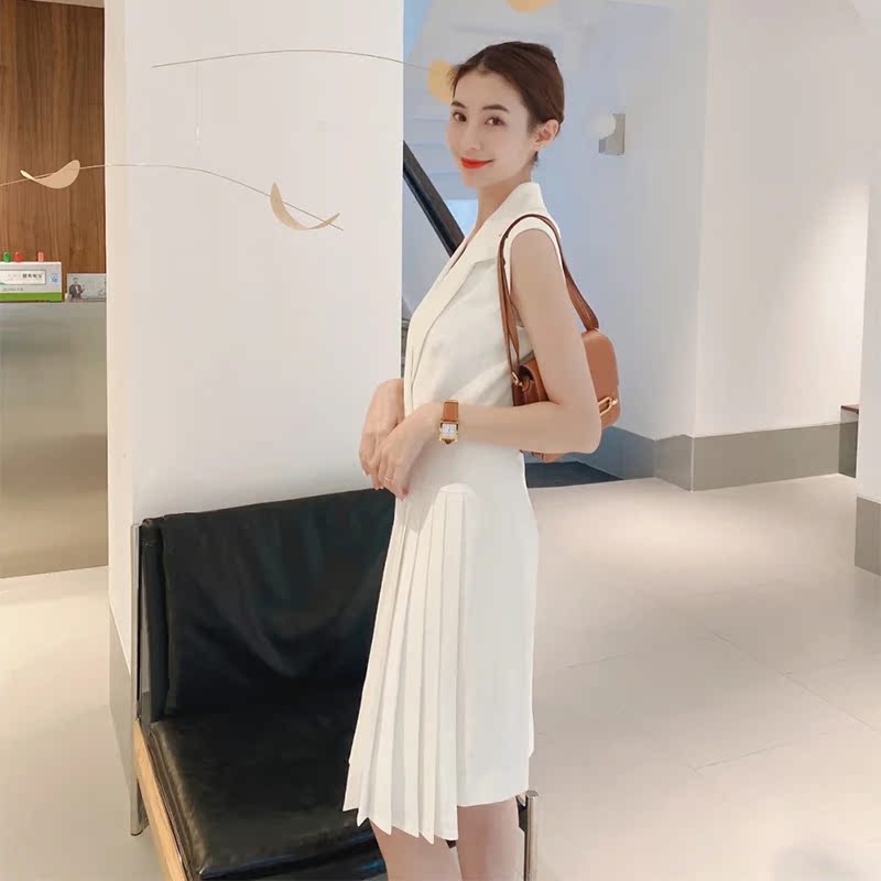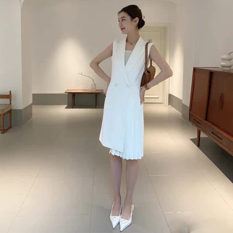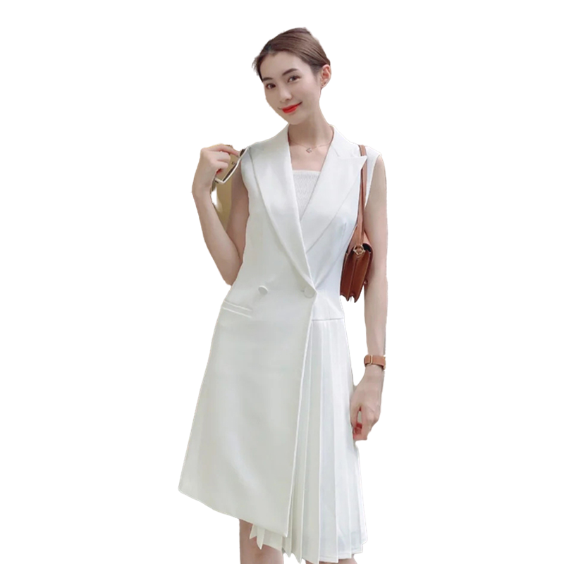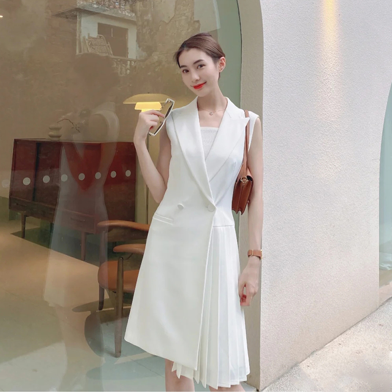 Summer new white double-breasted professional OL solid color pleated dress temperament waist waist slim mid-length suit skirt