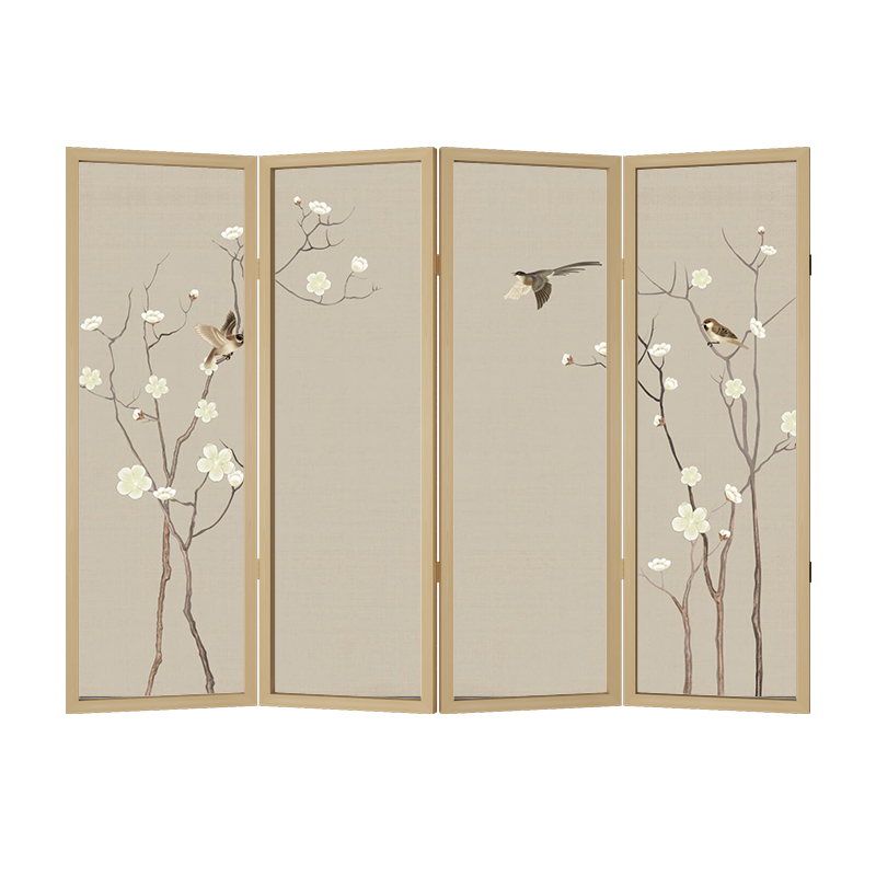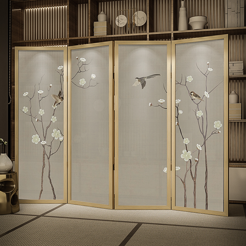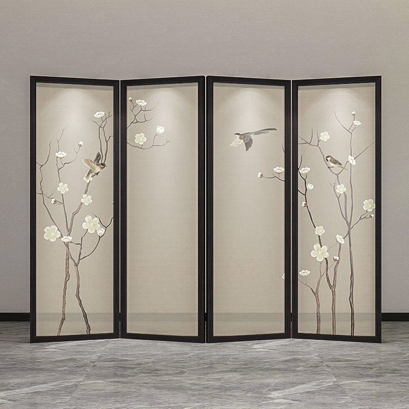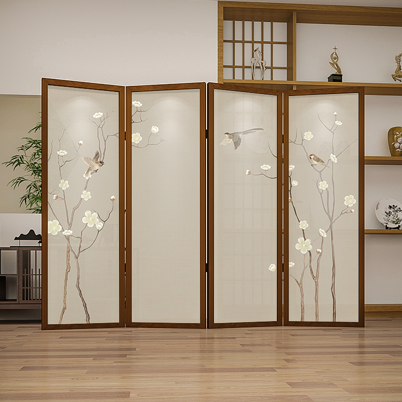 New Chinese meditation cloth art original wood color solid wood folding screen partition living room Xuanguan Hotel Sheltering Flowers Birds