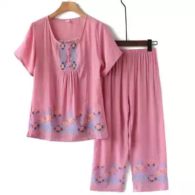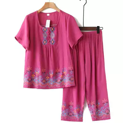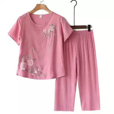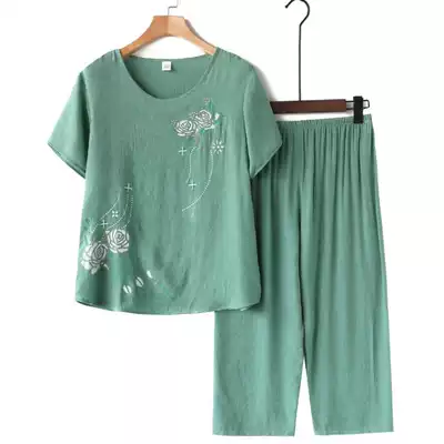 Middle-aged and elderly cotton hemp spring and autumn short sleeve pants set women's cotton silk large size mother wear casual home clothes half sleeves