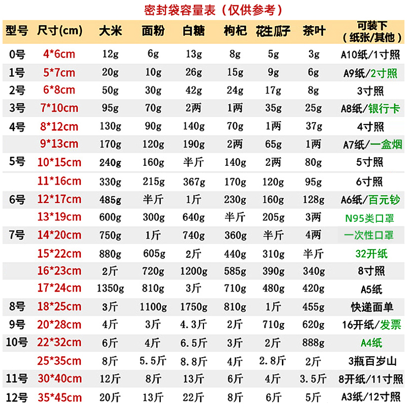 4x6cm 2000 pcs (size 0) 5x7cm 2000 pcs (size 1) 6x8cm 2000 pcs (size 2) 7x10cm 1000 pcs