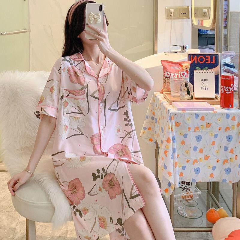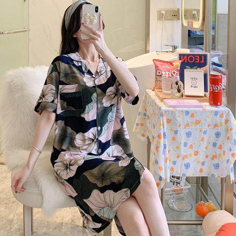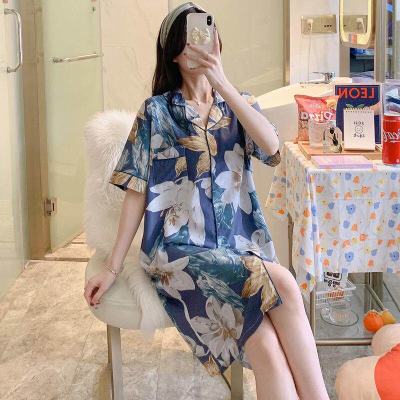 Silk-silk pyjamas woman Summer thin section European version shirt dress up and down dress pregnant woman can wear cotton silk artificial cotton sleeping dress outside