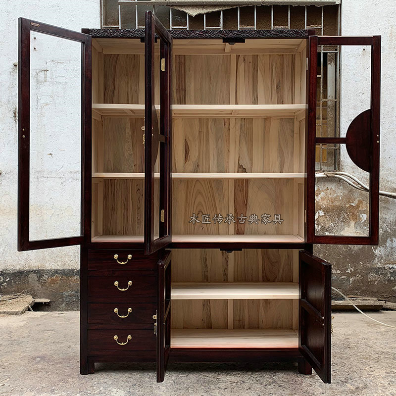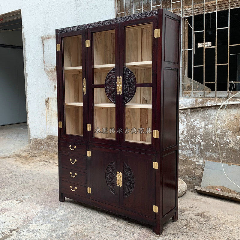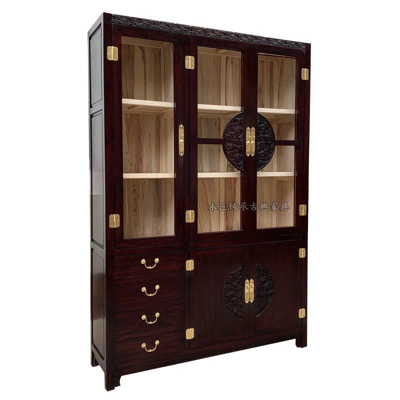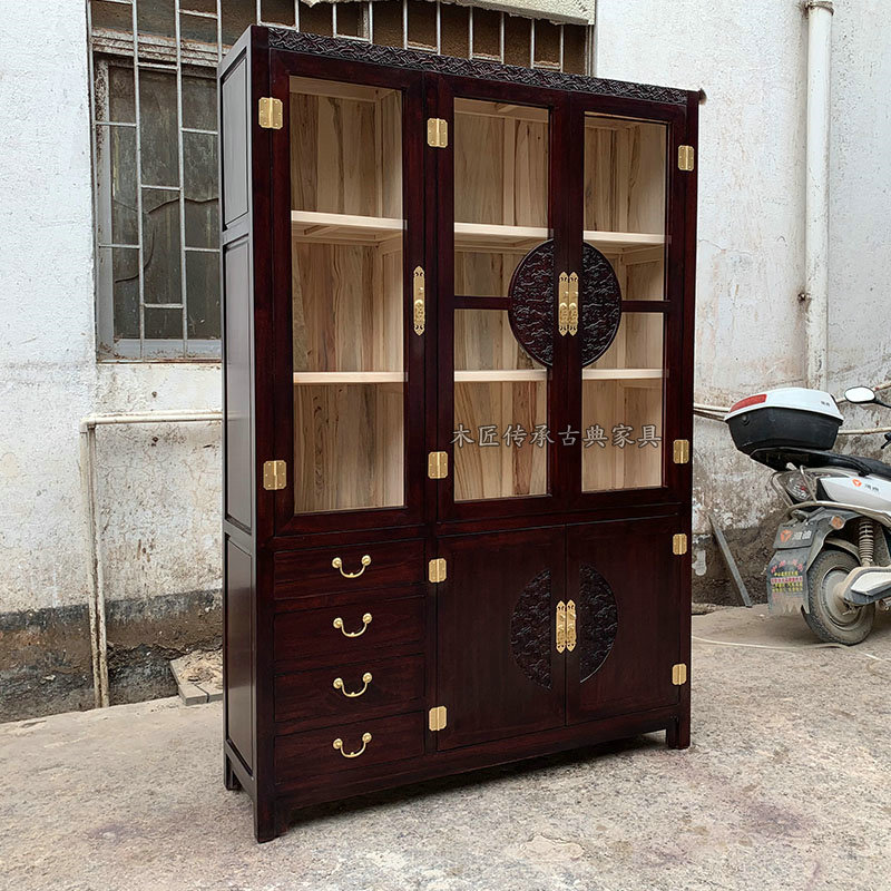 New Chinese bookcase full solid wood fragrant camphor wood bookcase book room Three-door filing cabinet with glass carved flower containing cabinet set to be made