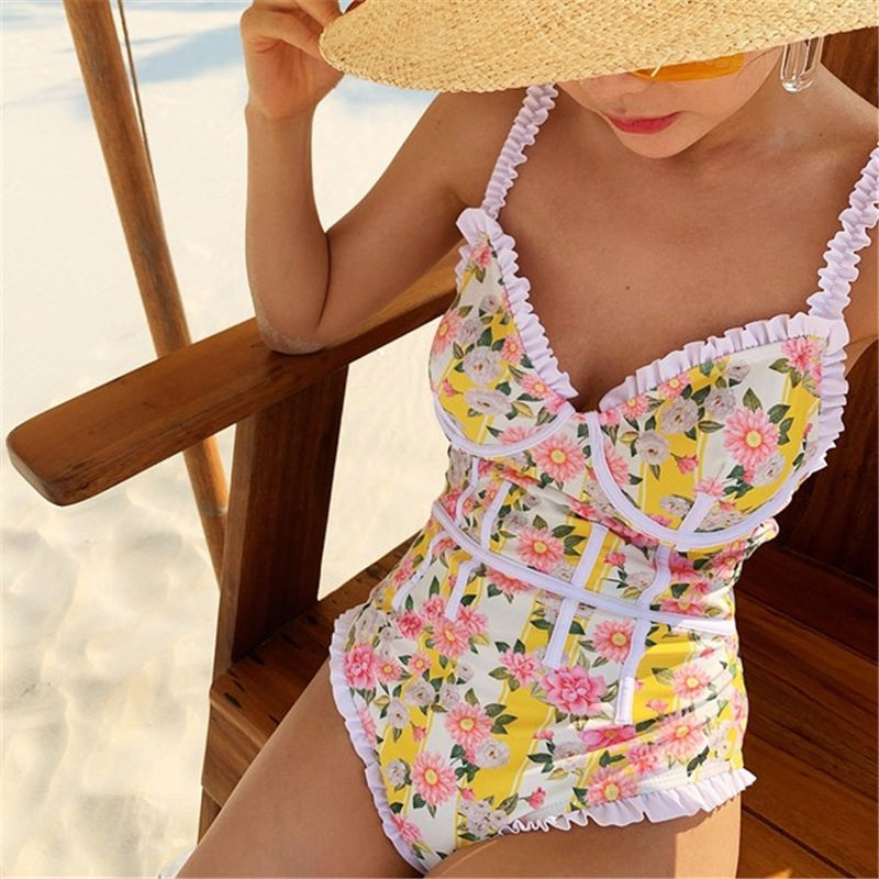 Ins wind one-piece with chest pad high elastic swimsuit female sexy backless floral holiday bikini bikini cross-border
