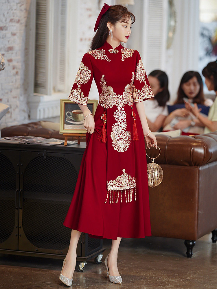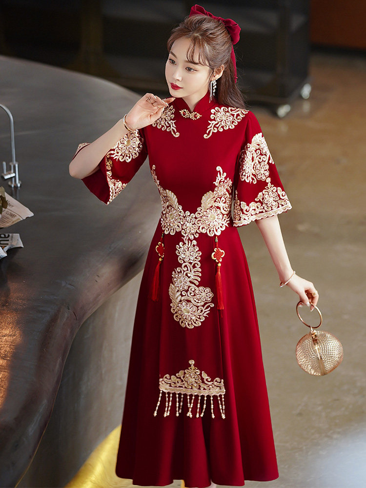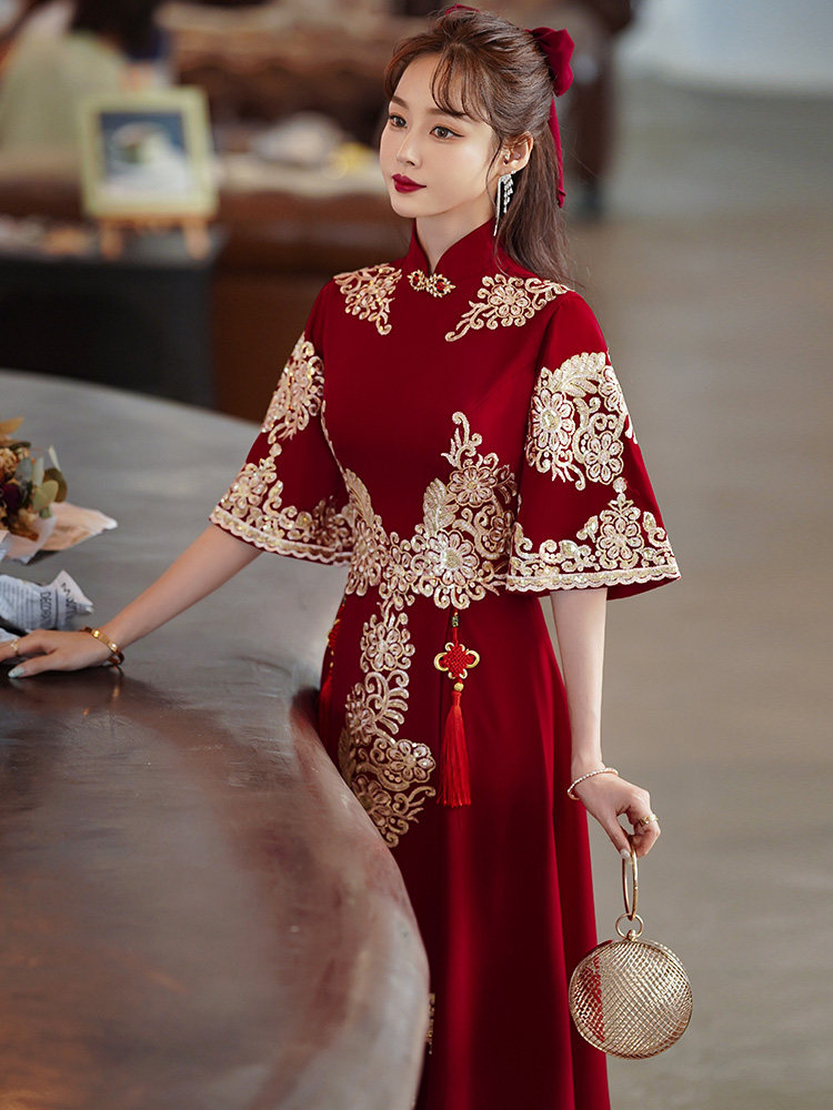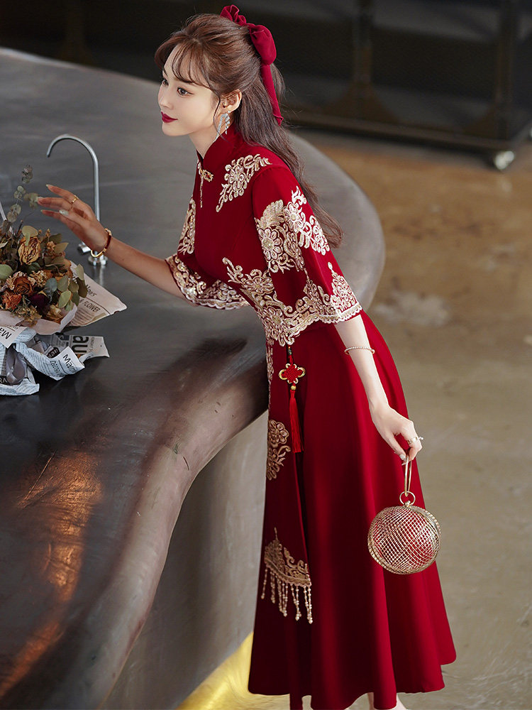 Toast dress bride cheongsam small autumn wine red Chinese retro wedding engagement back door thank you banquet dress