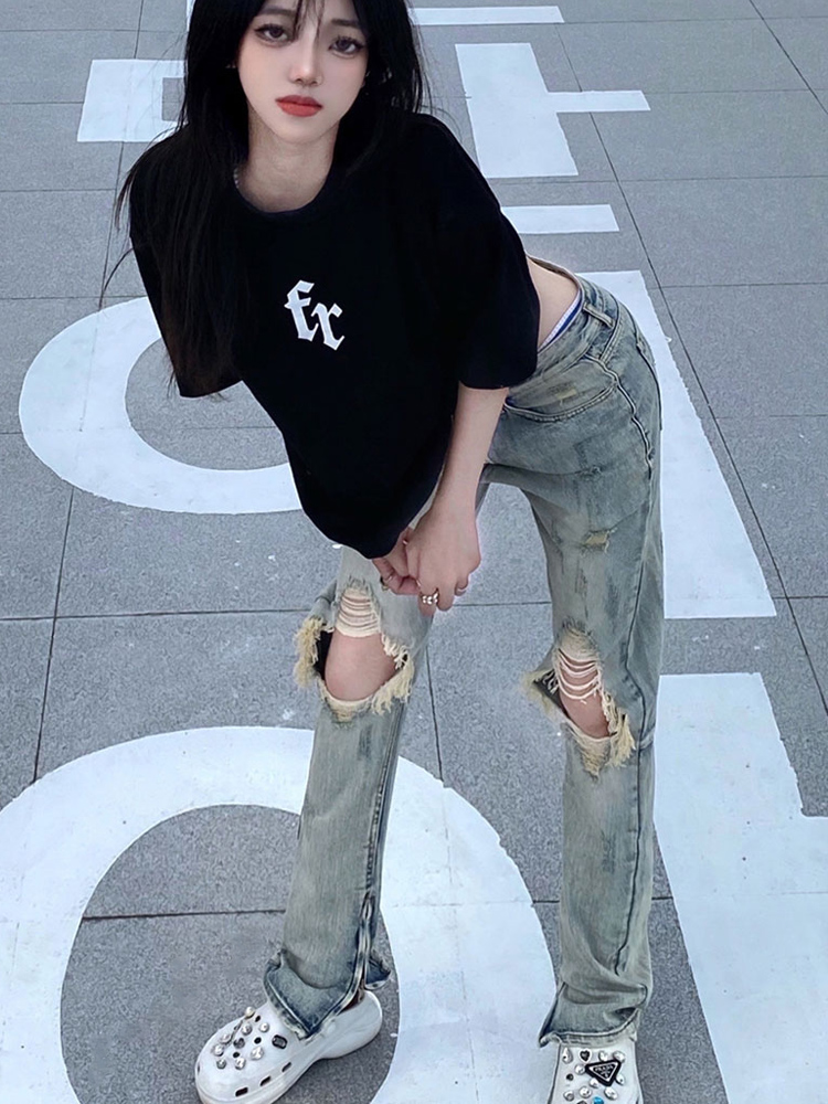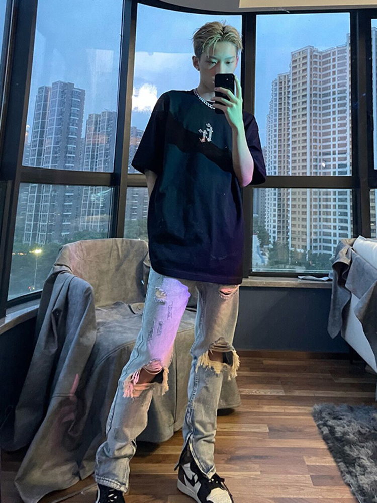 Breaking Hole Jeans Male Tide Card Superior Aesthetic High Street Light Color Washed Pants Guys Loose Straight Barrel Summer Thin