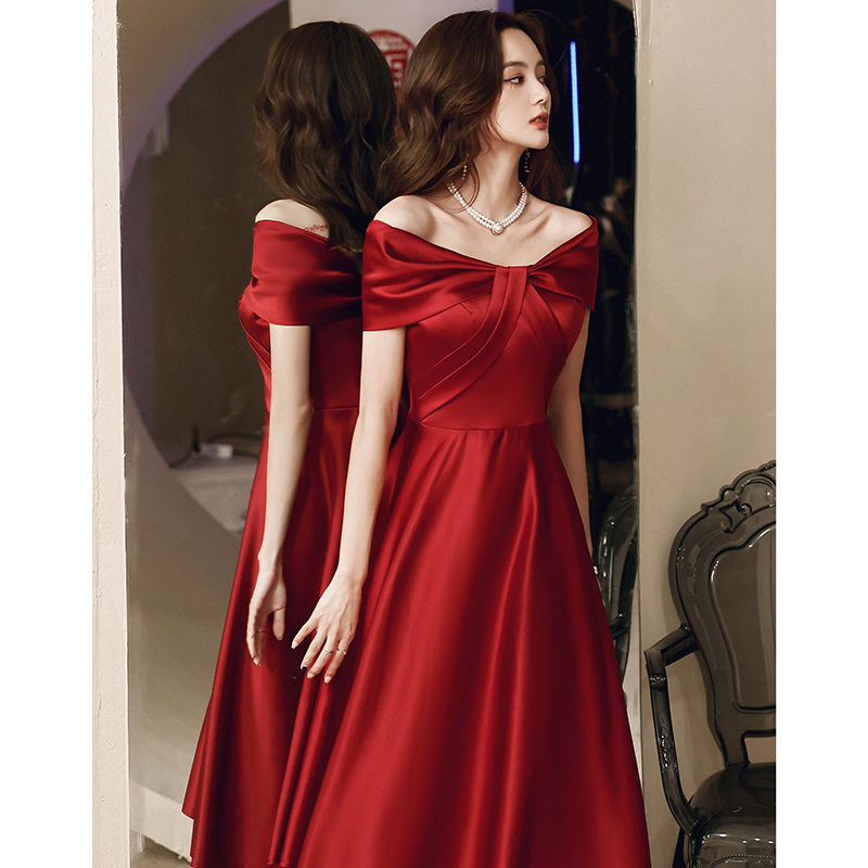 One-shoulder toast dress bride summer satin can usually wear engagement dress wine red dress skirt female summer