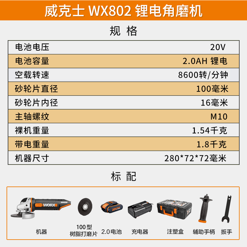 WX802 lithium electric angle mill WX802 WA3551 (2 0Ah lithium battery) WX802 9 naked muscle (no battery and charger)