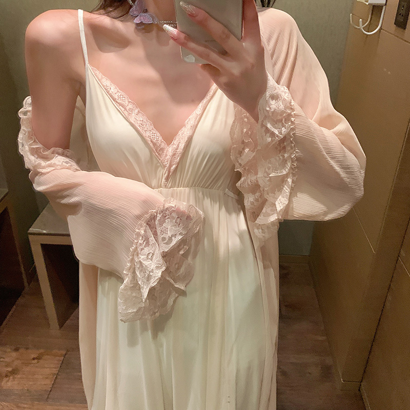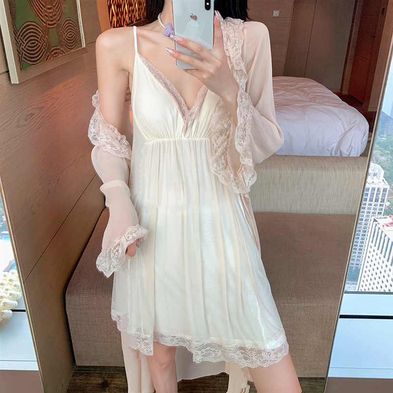 SADO YINER sexy ice silk pajamas women's summer thin section lace lace solid color sling mesh nightdress set