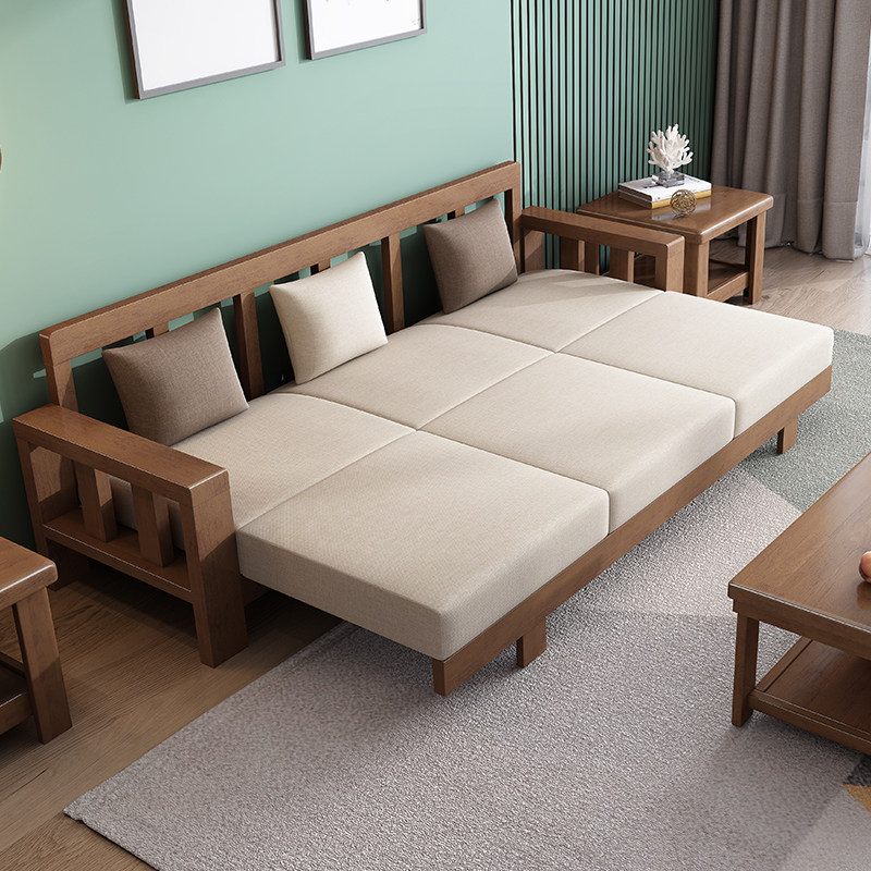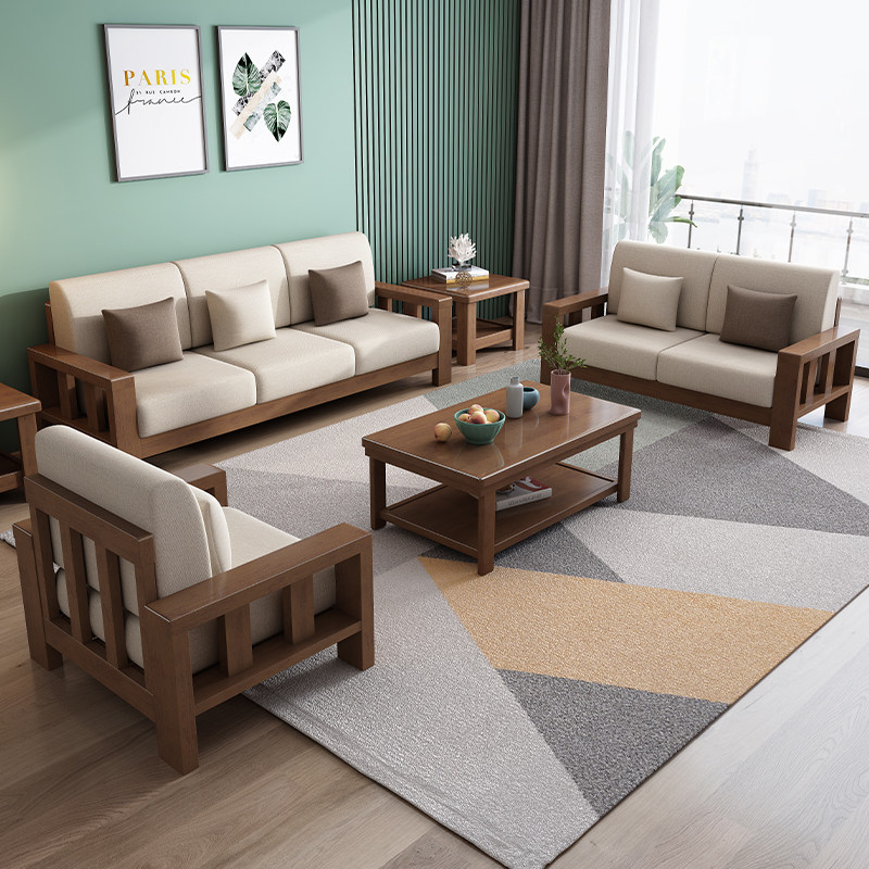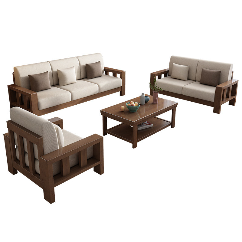 Chinese style all solid wood sofa combination home living room modern minimalist small apartment three-person wooden fabric sofa bed